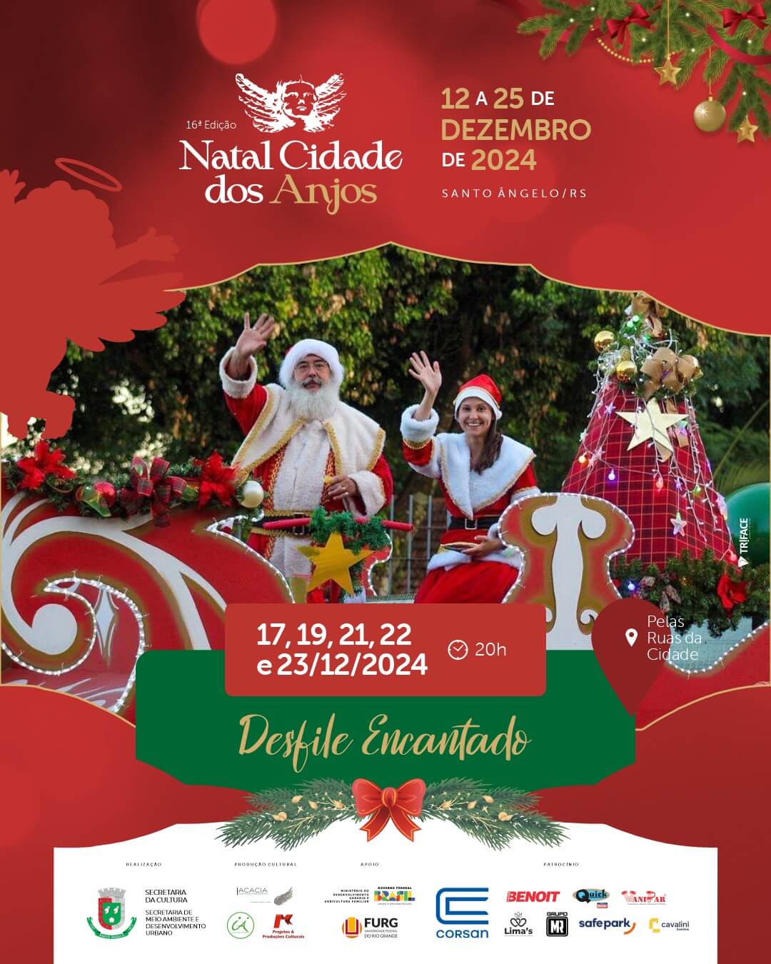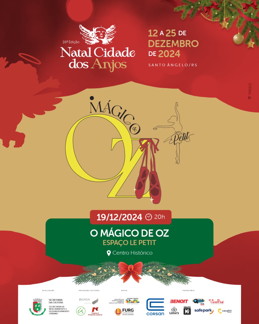 A programação do Natal Cidade dos Anjos segue nesta quinta-feira, 19, com várias atrações: desfile encantando e o cortejo celestial percorrendo as principais ruas da cidade, a apresentação de “O Mágico de Oz”, às 20 horas, no Espaço Le Petit, no Centro Histórico de Santo Ângelo.