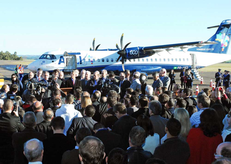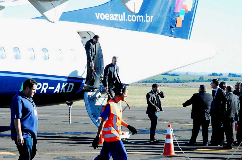 A aeronave modelo ATR-72, um turboélice da EMBRAER, com capacidade para 72 passageiros, pousou na Capital Missioneira por volta das 15h45min, trazendo entre seus ocupantes o governador do Estado José Ivo Sartori, o prefeito Jacques Barbosa, o secretário de Estado dos Transportes Pedro Wetsphalen, os deputados estaduais Eduardo Loureiro, Frederico Antunes e Gabriel Souza; os deputados federais Cajar Nardes e Darcísio Perondi; o ministro do Tribunal de Contas da União João Augusto Nardes, o secretário nacional da Aviação Civil, Dario Lopes, e o diretor da Azul Linhas Aéreas, Ronaldo Veras, para a solenidade oficial de inauguração das obras de adequação do terminal de passageiros e da seção contra incêndios.