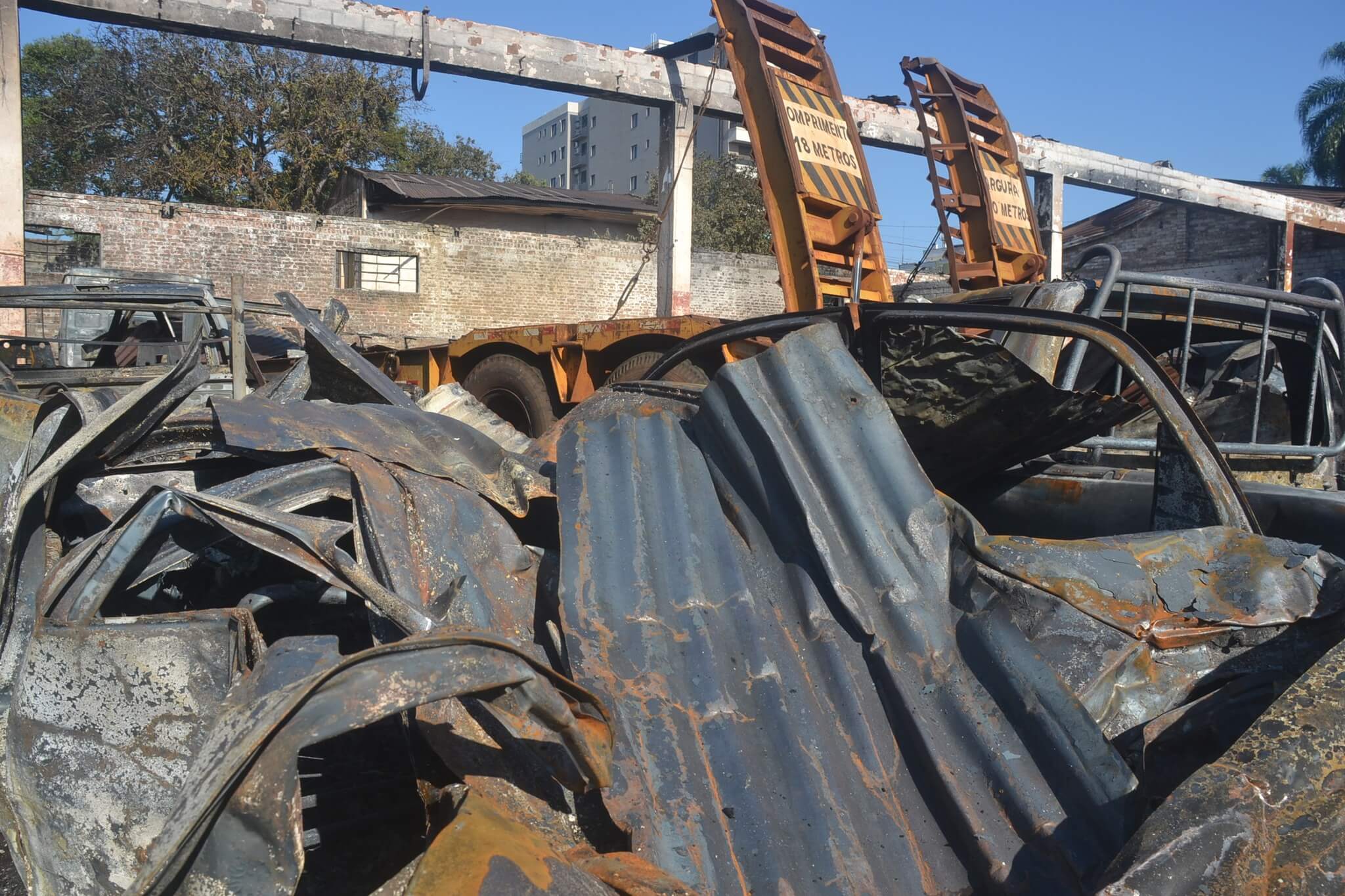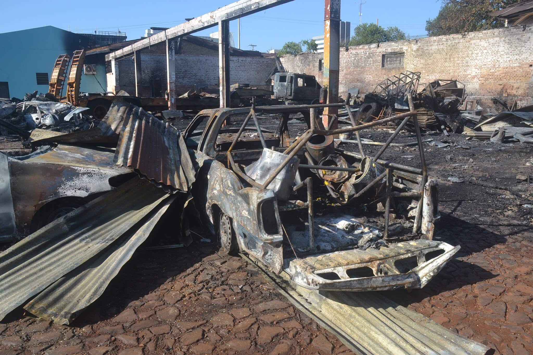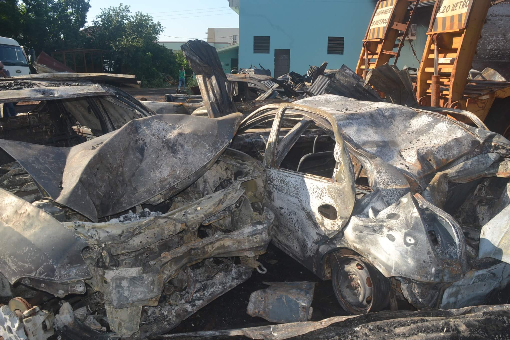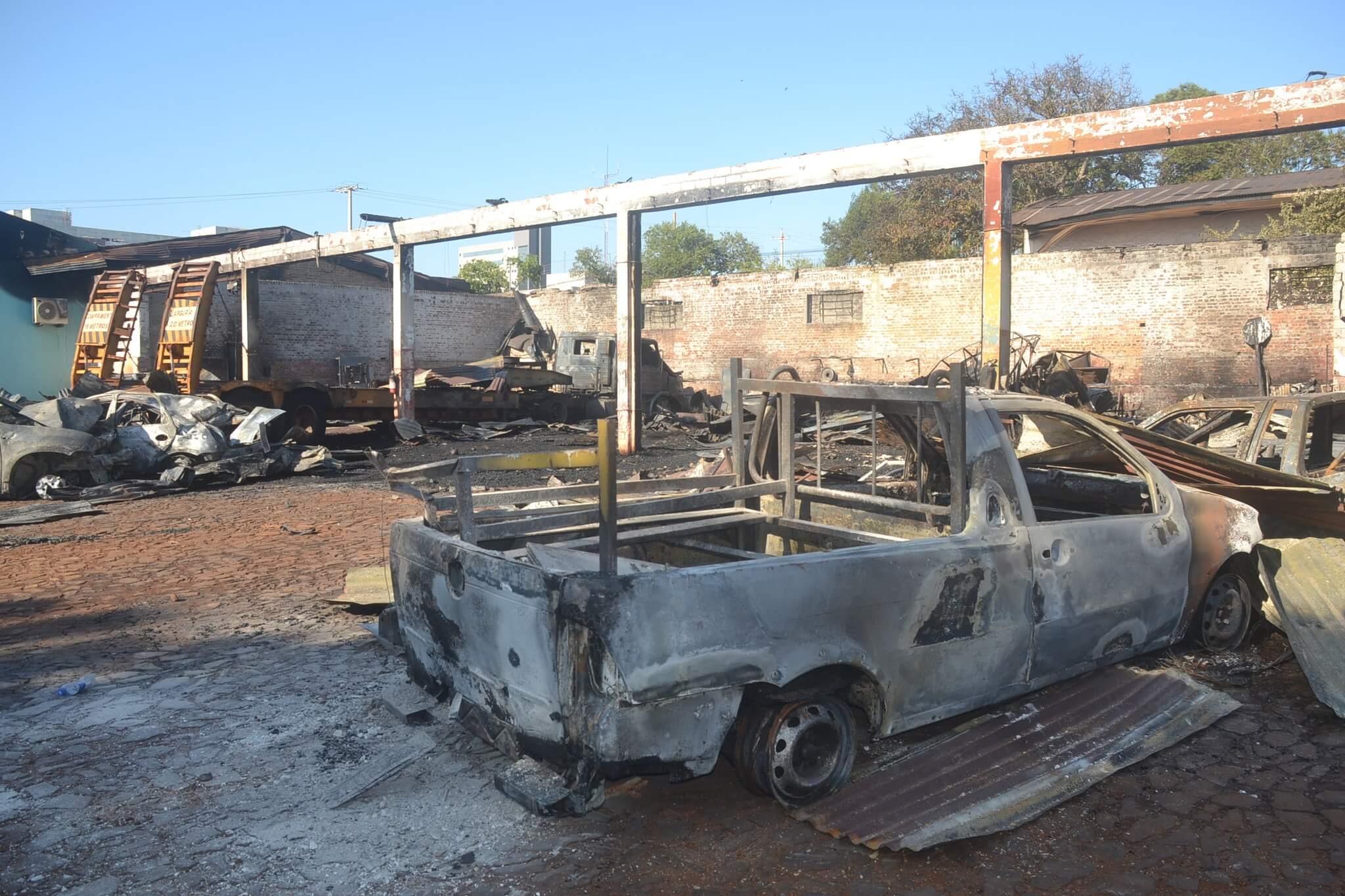 Garagem foi atingida por incêndio na noite de terça-feira, 7. Doze veículos ficaram destruídos. Dez deles contam com seguro