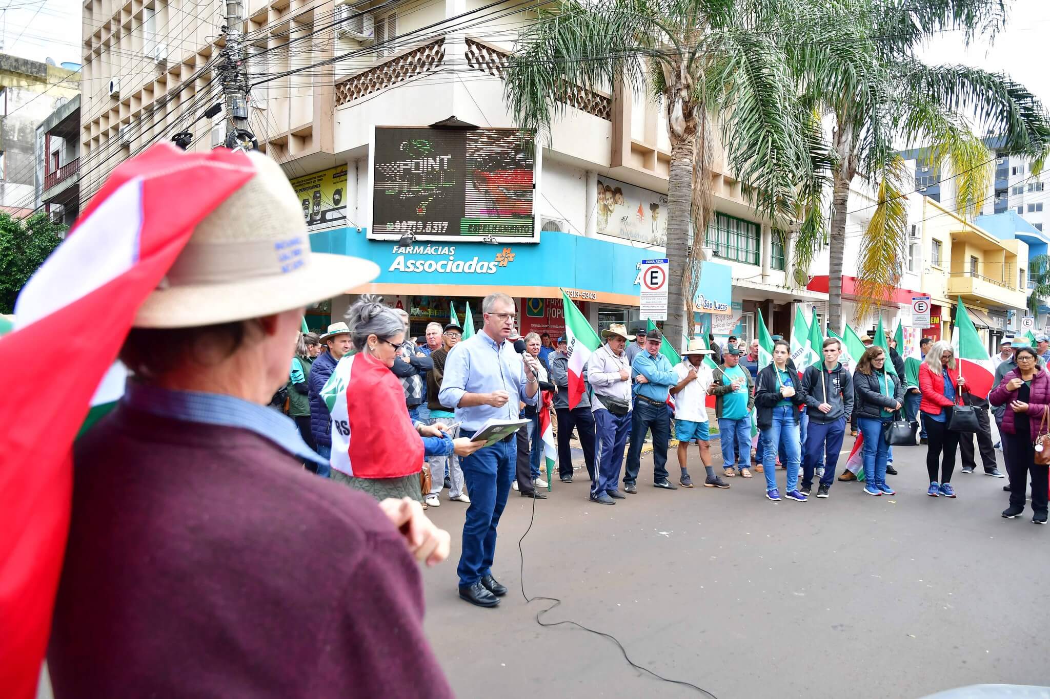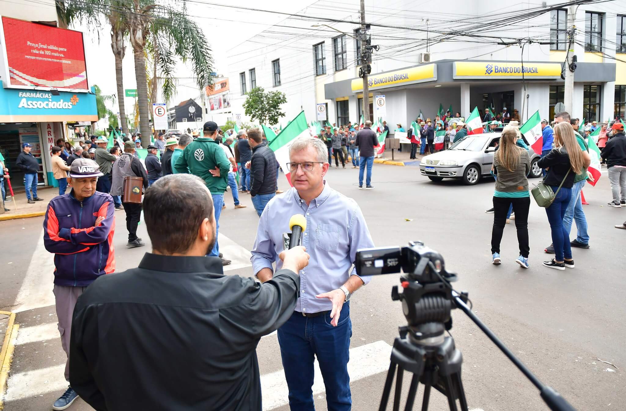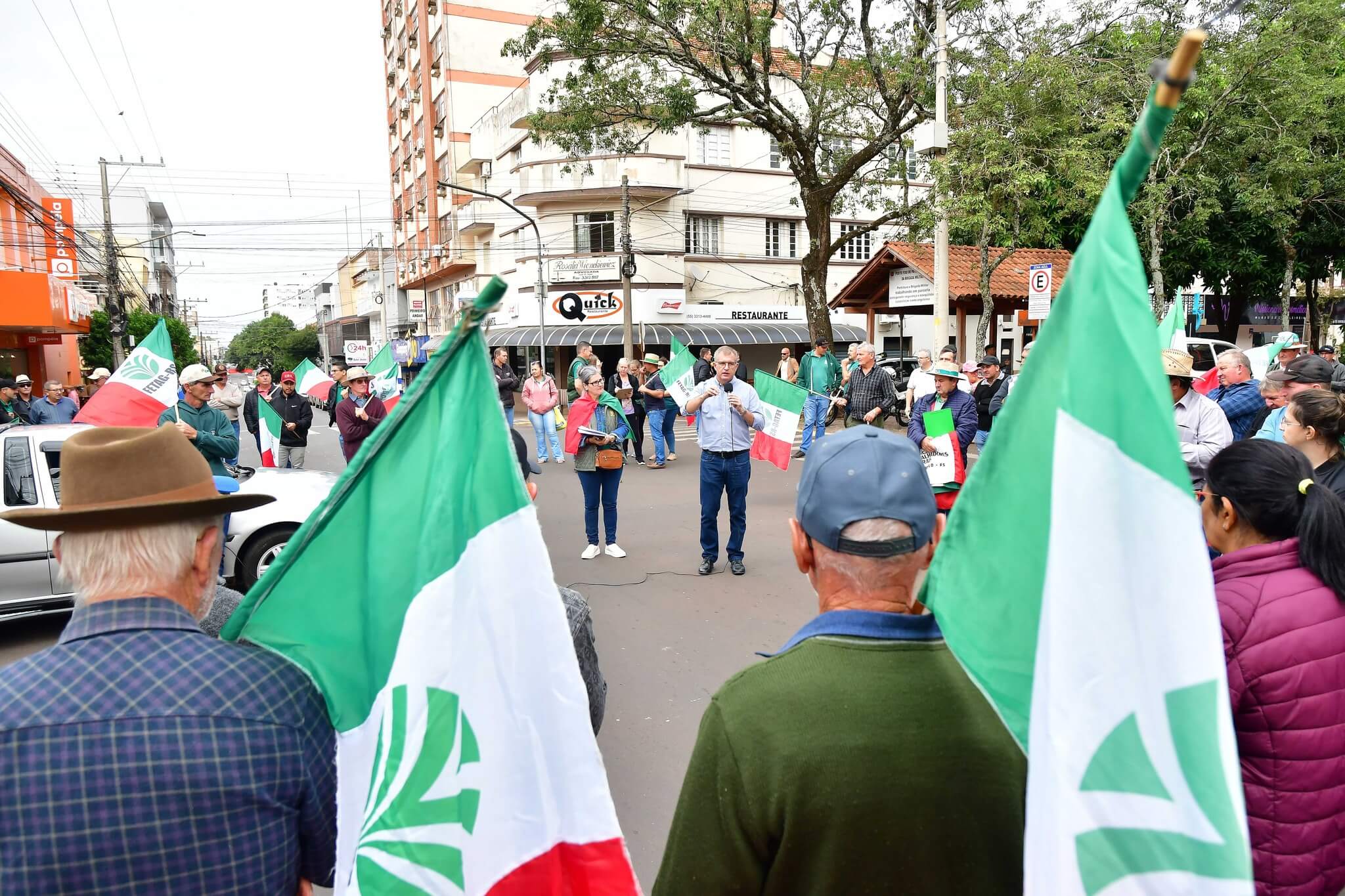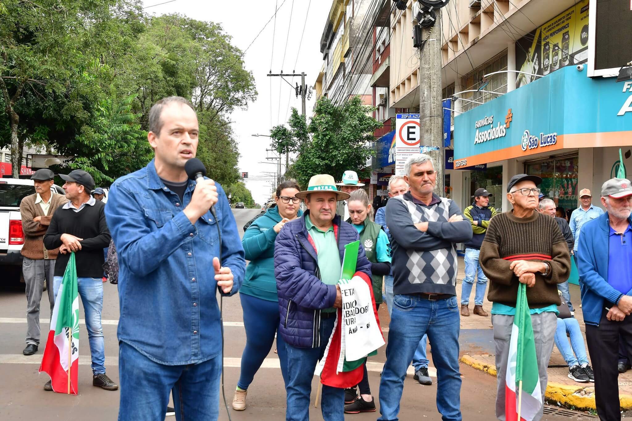 O prefeito Jacques Barbosa participou da manifestação realizada em frente ao Banco do Brasil. Ao lado da coordenadora da Regional Missões 1 da Fetag, Rozane Scherer, e do presidente do Sindicato dos Trabalhadores Rurais (STR), Daniel Casarin, o chefe do Executivo reforçou o apoio que o Governo Municipal presta, por entender a importância da agricultura familiar para a economia local.