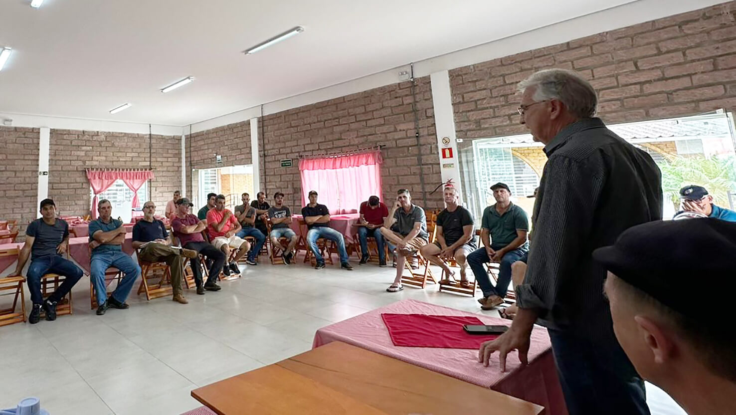 O prefeito em exercício Volnei Teixeira abriu a reunião saudando os presentes e reafirmando o compromisso do Governo Municipal com o fortalecimento das agroindústrias, da agricultura familiar e das associações de produtores, destacando os investimentos da gestão na infraestrutura do setor, desde a produção até a comercialização.