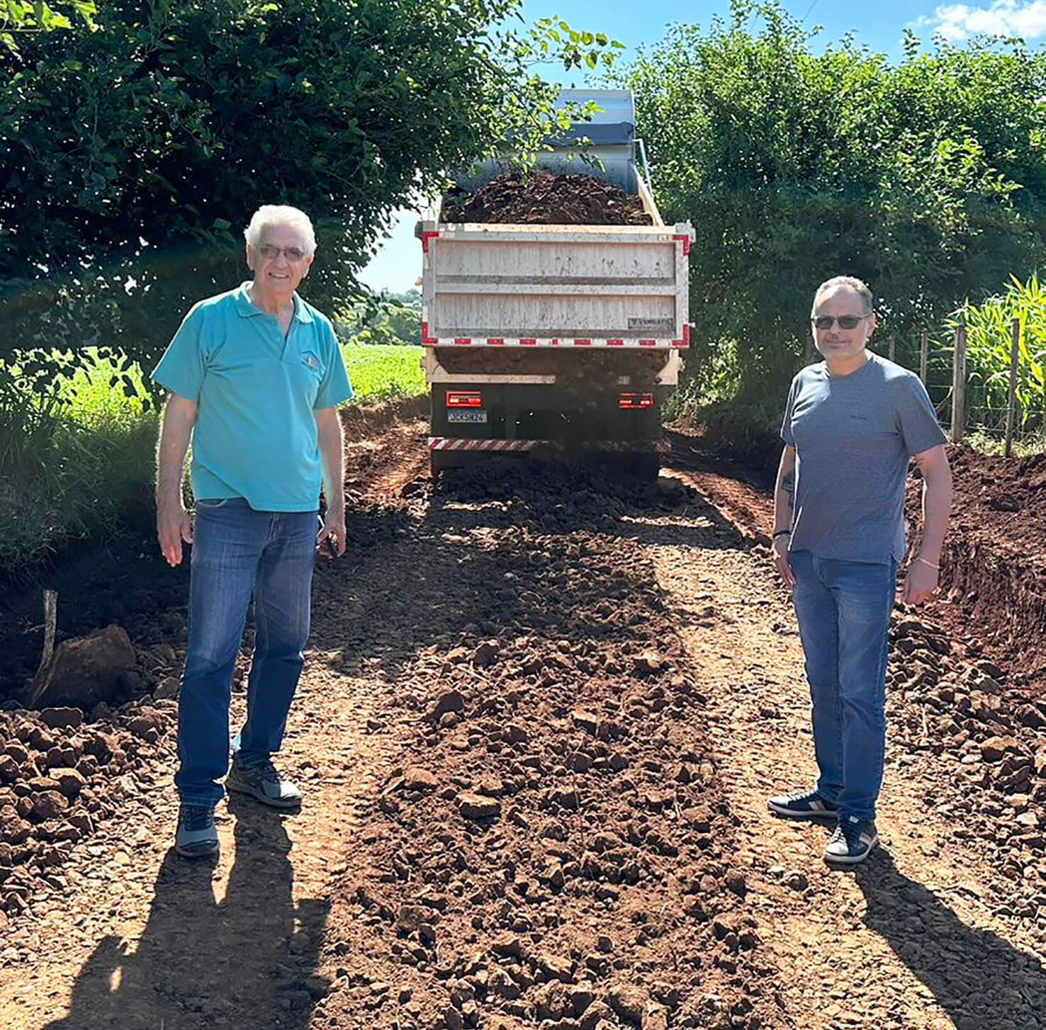 Prefeito em exercício Volnei Teixeira e secretário Queiroz estiveram acompanhando os trabalhos no meio rural. São cinco equipes trabalhando em ritmo intenso