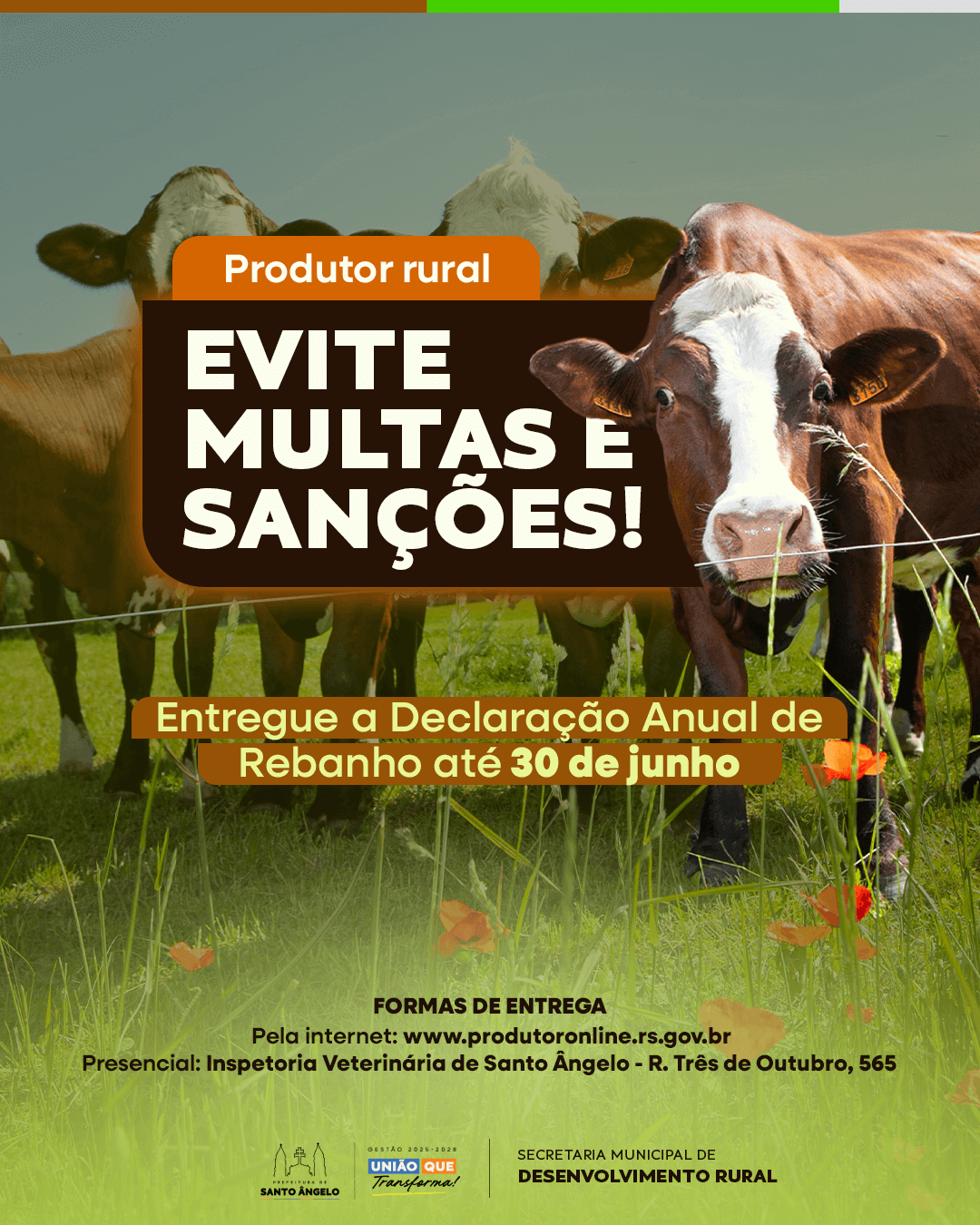 A Prefeitura de Santo Ângelo, por meio do Serviço de Inspeção Municipal, informa que a Declaração Anual de Rebanho referente ao ano de 2025 deve ser enviada até o dia 30 de junho. Todos os produtores rurais que possuem animais são obrigados a fazer a declaração de seu rebanho.