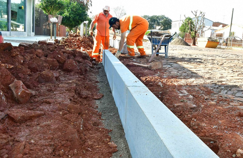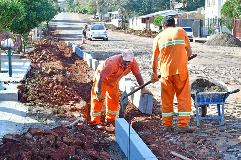 A empresa vencedora do processo de licitação para as melhorias nos bairros trabalha agora na construção dos passeios públicos na Rua Vinte de Setembro, entre a Avenida Salgado Filho e a Rua Natale Zanetti.