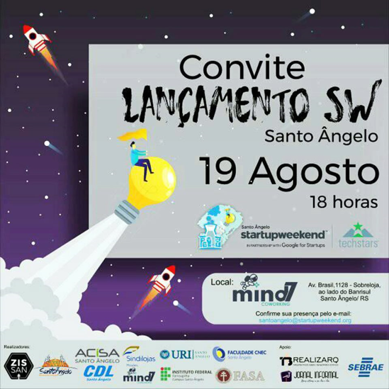 Será lançado nesta segunda-feira, 19, às 18 horas, o 1º Startup Weekend Santo Ângelo. Evento acontece de 25 a 27 de outubro na Mind7 Coworking (Avenida Brasil, 1128 – 2º piso), como uma oportunidade de criar empresa startup em 54 horas. Lançamento hoje à noite também acontece na Avenida Brasil.