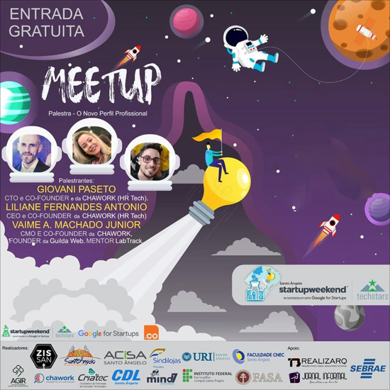 Nos dias 29, 30 e 31 de Agosto, ocorrem quatro Meetups preparatórios para o Startup Weekend Santo Ângelo, evento que acontece de 25 a 27 de Outubro na Capital das Missões. Os eventos acontecerão nas cidades de São Luiz Gonzaga, Santa Rosa, Santo Ângelo e em Ijuí. Os palestrantes destes Meetups serão os fundadores da Chawork: Liliane Fernandes, Vaime Alves Machado Junior e Giovani Paseto, com o tema “O Novo Perfil Profissional”.