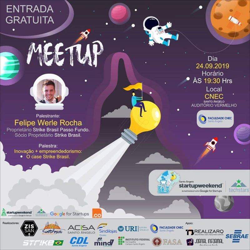 O palestrante do décimo meetup será Felipe Werle Rocha, proprietário da Strike Brasil Passo Fundo e sócio-proprietário da Strike Brasil, que abordará o tema “Inovação + Empreendedorismo: o case Strike Brasil”.