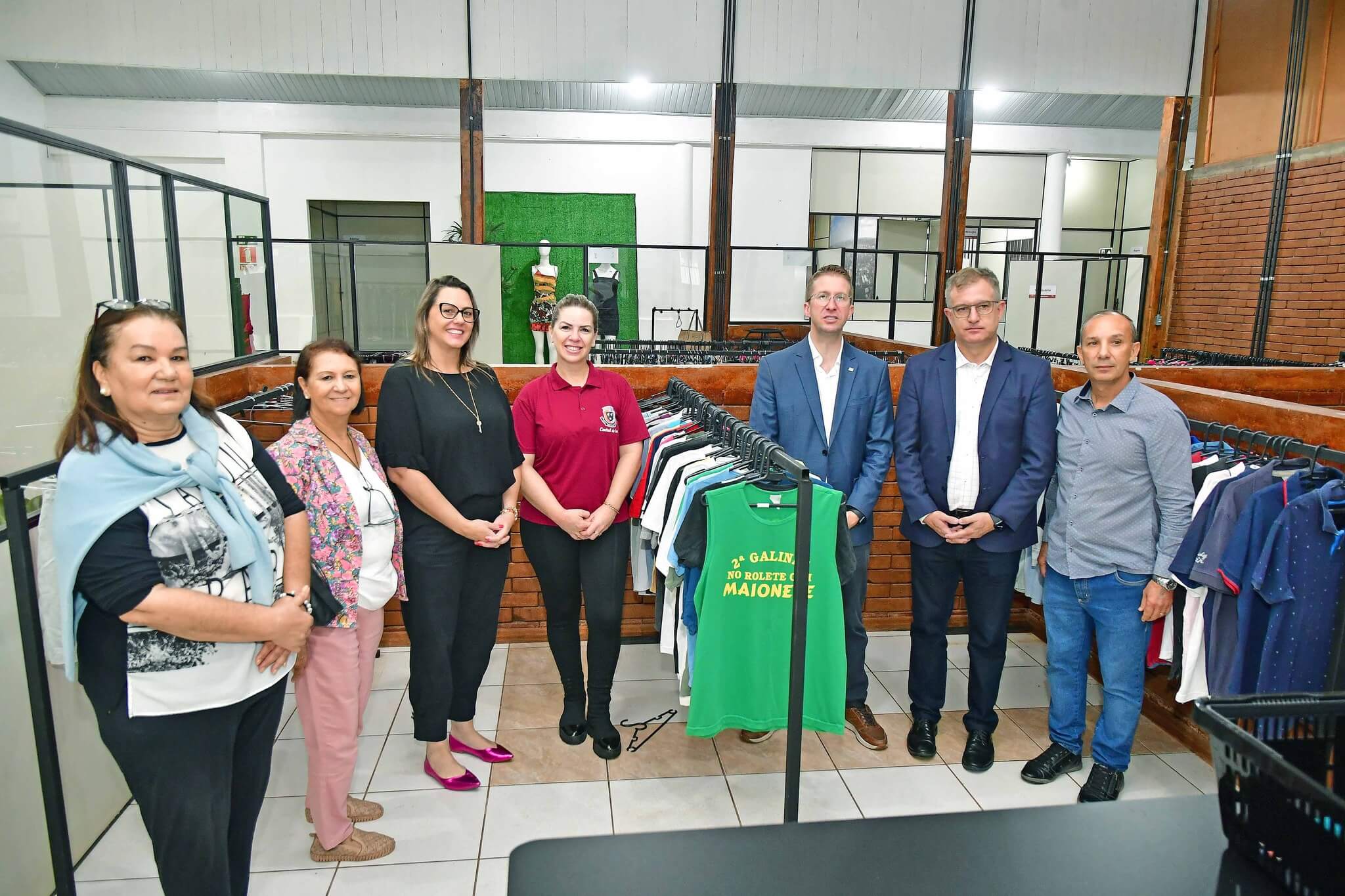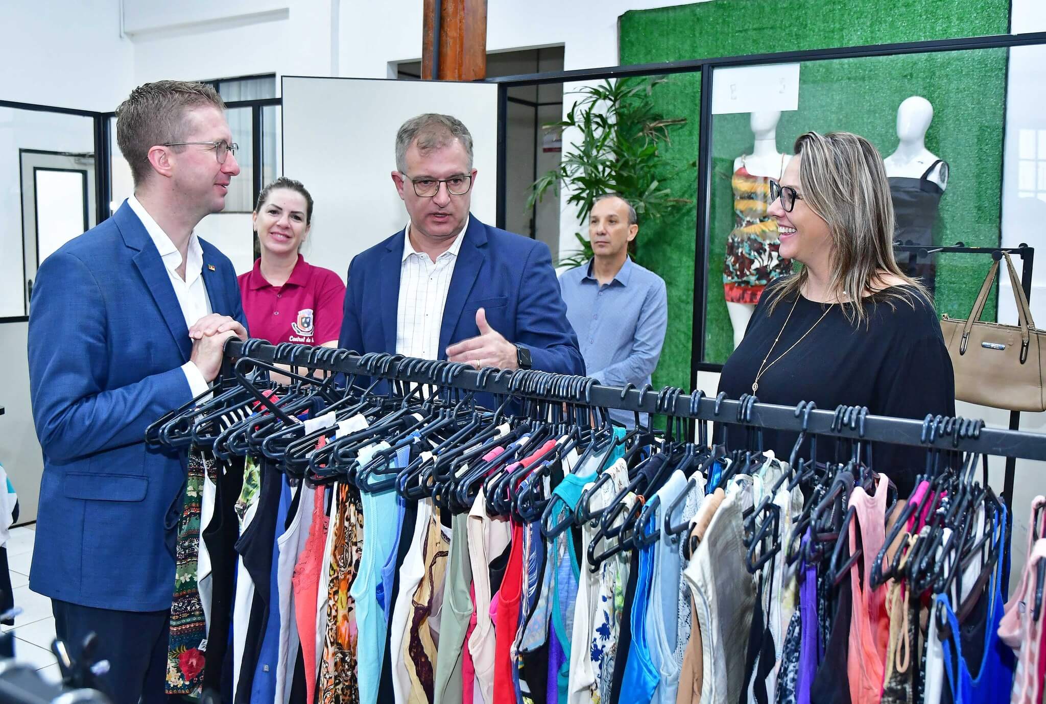 Após ato de entrega dos kits do programa Mãe Gaúcha na Secretaria Municipal de Desenvolvimento Social, Fantinel visitou as instalações da Central do Bem ao lado do prefeito Jacques Barbosa, da primeira-dama Juliana Barbosa, idealizadora do programa solidário, e da diretora Tassiana Ribeiro.