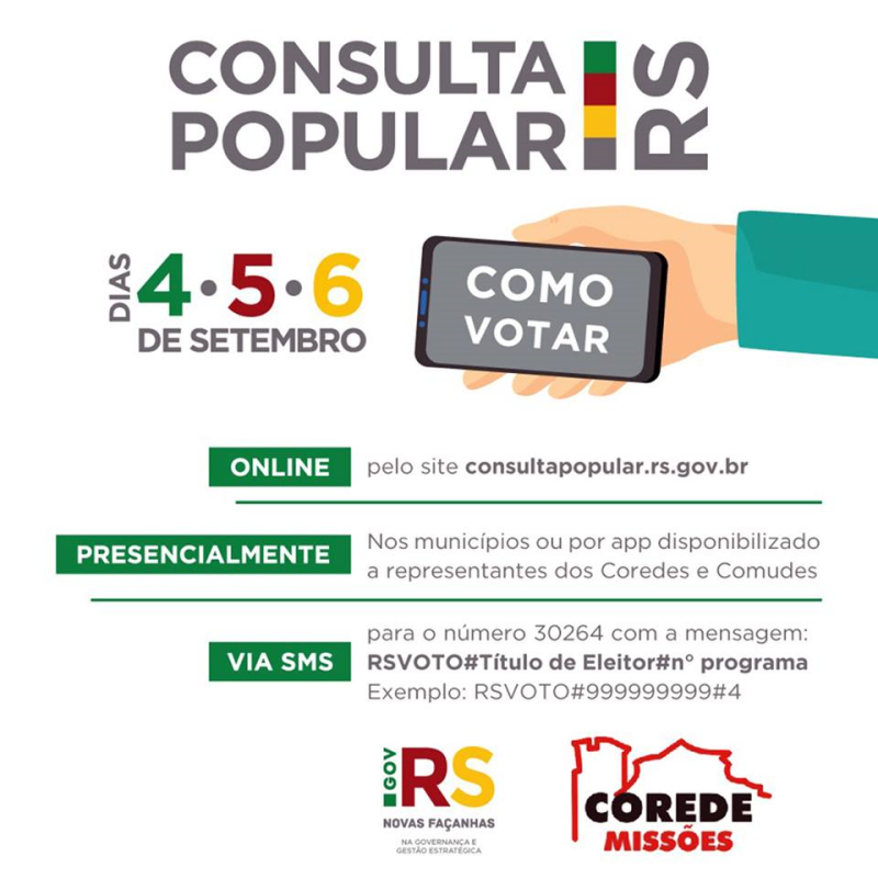A votação da Consulta Popular que definirá os recursos para o Orçamento do Estado de 2020, poderá ser realizada a partir desta quarta-feira, 4, até sexta-feira, 6. Eleitores podem votar no site www.consultapopular.rs.gov.br de posse do título de eleitor. Projeto Competitividade das cadeias produtivas – construção do Consórcio Regional de Inspeção Sanitária Integrada (SIM Missões), já instaurado pelo Governo Municipal foi elencado como prioritário.