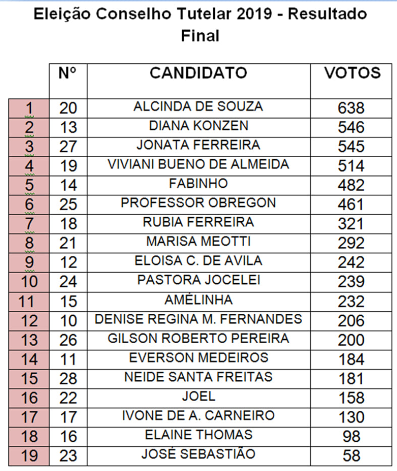 O Conselho Municipal dos Direitos da Criança e do Adolescente (COMIDCA) e a Comissão Eleitoral do processo de escolha dos conselheiros tutelares de Santo Ângelo divulgaram oficialmente na manhã desta segunda-feira, 07, o resultado das eleições realizadas no domingo, dia 6. Dezenove candidatos concorreram.