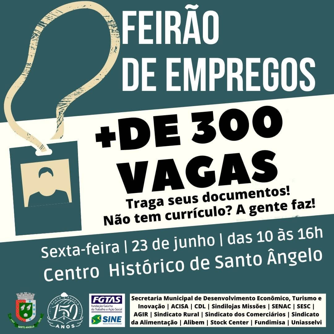 Um grande movimento envolvendo o Governo Municipal, entidades representativas patronais e de trabalhadores promove na próxima sexta-feira, 23, o Feirão de Empregos em Santo Ângelo, com a oferta de mais de 300 vagas de trabalho. O evento, alusivo à Semana do Migrante, será no Centro Histórico de Santo Ângelo, das 10 às 16 horas e disponibilizará uma série de ações.