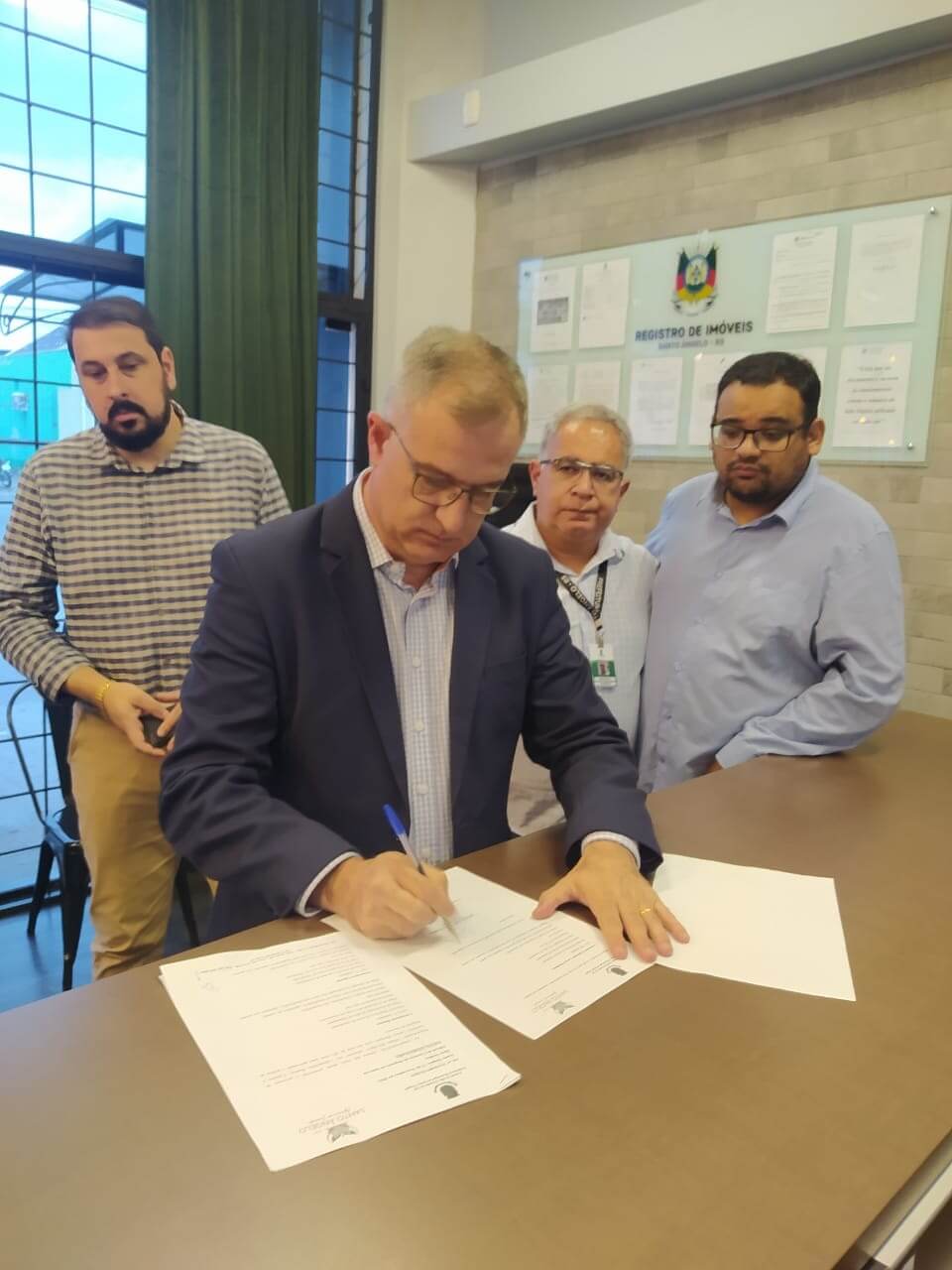 O chefe do Executivo foi recebido pelo titular do cartório, o tabelião Jean Jesse e esteve acompanhado do secretário municipal de Planejamento Urbano e Habitação, Hasadias Amaral da Silva, do coordenador de Habitação e Regularização Fundiária da SEPLAN, Matheus Severo, vereador Rodrigo Flores, do engenheiro Éder Teixeira Guedes e do assessor da SEPLAN, Fábio Saragoso.
