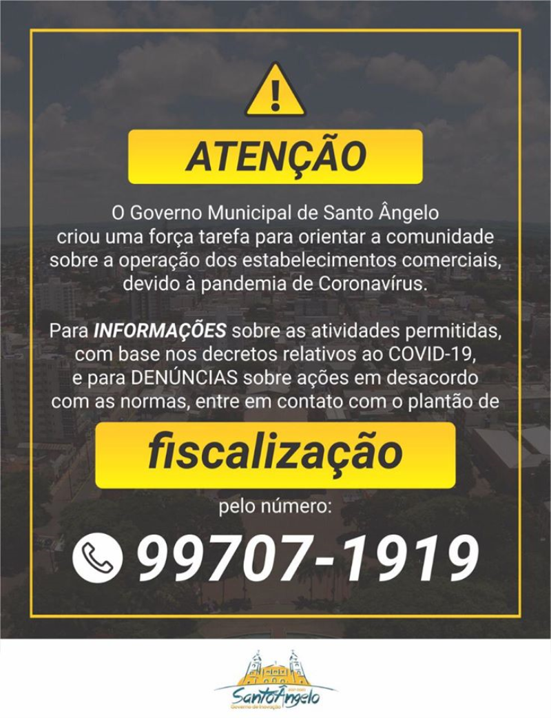 Para denúncias relacionadas ao descumprimento das regulamentações do decreto 3908/2020, está disponível o telefone 9 9707 1919, com atendimento 24 horas.