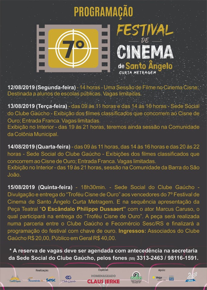 O Festival de Cinema de Santo Ângelo termina na quinta-feira, 15, na sede social do Clube Gaúcho com a divulgação e premiação dos vencedores desta sétima etapa do concurso com o “Cisne de Ouro”. Na sequência a apresentação do espetáculo “O escândalo de Philippe Dussaert”, com o ator global Marcos Caruso. A peça teatral é um espetáculo em parceria entre o Clube Gaúcho e Fecomércio SESC/RS.