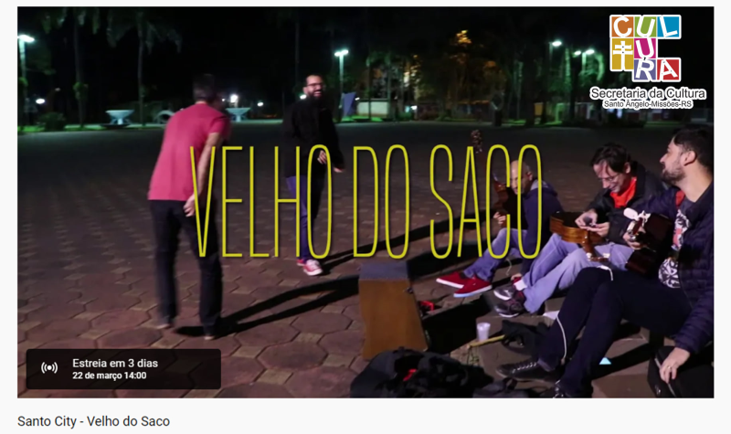 Descrição: Videoclipe produzido pelo artista Henrique Denis Lucas em ruas e locais de nossa cidade. “Santo City”. Foi o primeiro videoclipe da Banda Velho do Saco, formada por diversos amigos, artistas de Santo Ângelo. Lançado em 2019, o clipe mostra algumas nuances e peculiaridades da noite santo-angelense, as casas de festas, o movimento na Praça da Catedral Angelopolitana e a efervescência jovem pela cidade. O filme conquistou o 1º lugar do 1º concurso de vídeos da ZISSAN e o 3º lugar no júri popular do 7º Festival de Cinema de Santo Ângelo – curta metragem, ambos em 2019.