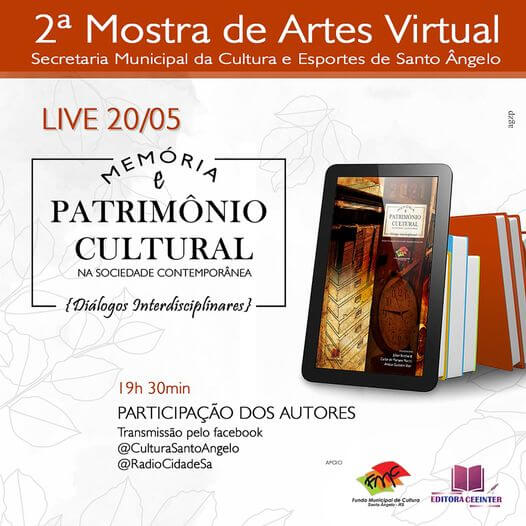 Resultado do edital lançado pela Secretaria de Cultura e Esporte no ano passado, que repassou R$ 70 mil para 28 projetos de santo-angelenses, por meio do Fundo Municipal de Cultura, será lançado oficialmente nesta quinta-feira, 20, às 19h30min, em live, a obra literária "Memória e Patrimônio Cultural na sociedade contemporânea: diálogos interdisciplinares".