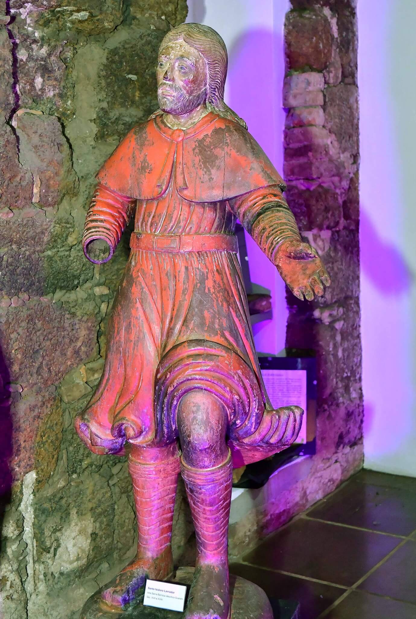 A estátua de Santo Isidoro Lavrador Missioneiro, arte sacra barroca do período jesuítico-guarani, tem um metro e 31 centímetros de altura, incluindo a base em madeira, pesa 29 quilos e 52 centímetros de largura. A obra esculpida entre os séculos XVII e XVIII em madeira é atribuída a José Brasanelli.