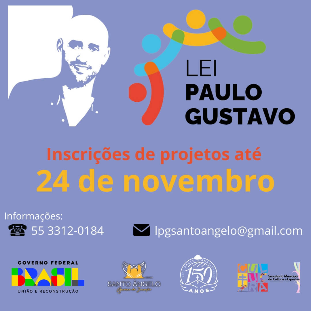 Artistas e agentes culturais tem até às 23h59min desta sexta-feira, 24, para inscreverem seus projetos nos editais da Lei Paulo Gustavo. As inscrições podem ser feitas no endereço eletrônico https://pmsantoangelocultura.abase.com.br. Mais informações podem ser obtidas pelo fone (55) 3312-0184 ou e-mail lpgsantoangelo@gmail.com.