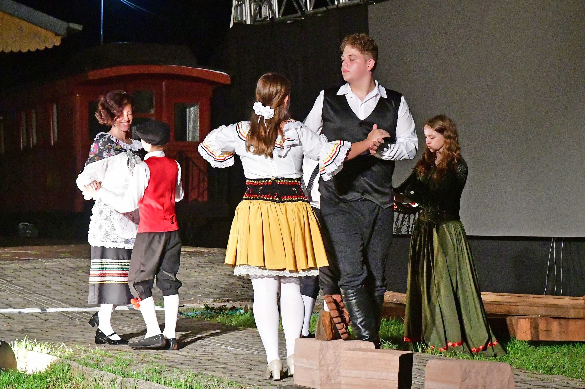 A encenação inicia com a história jesuítica-guarani e a redução. Enfoca a fase de Santo Ângelo como vilarejo de Cruz Alta e a emancipação em 22 de março de 1873, evidenciando a força da pecuária e do tropeirismo como base econômica. Também merece destaque a chegada dos imigrantes e a força da produção trazida por eles.