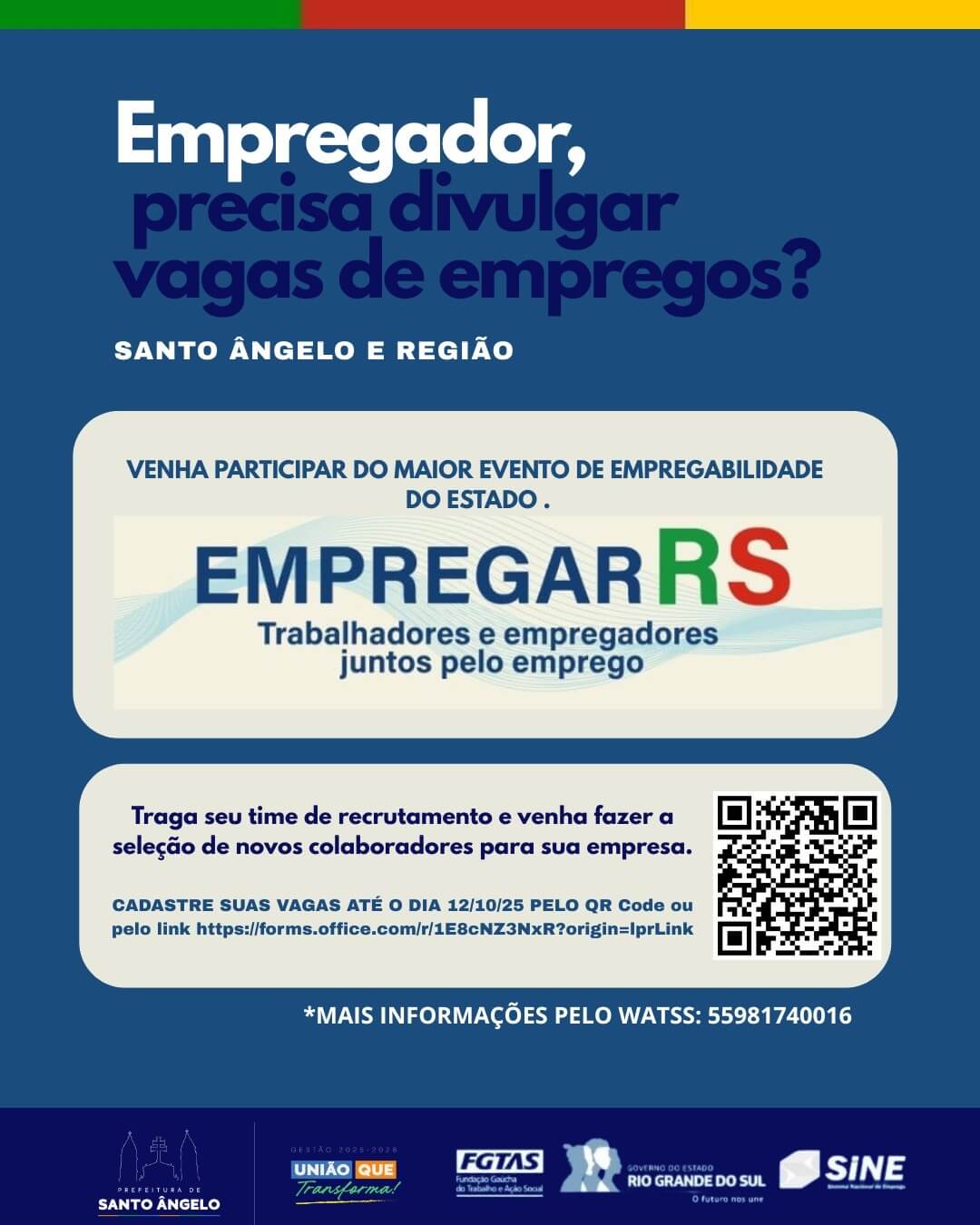 Promovido pelo Governo do Estado, por meio da FGTAS/Sine, o Empregar RS 2025 conta com o apoio da Prefeitura de Santo Ângelo, através das Secretarias Municipais de Desenvolvimento Social e Cidadania, e de Desenvolvimento Econômico, Turismo e Inovação.