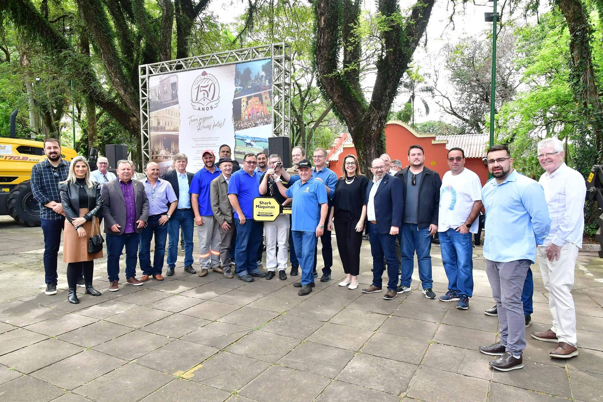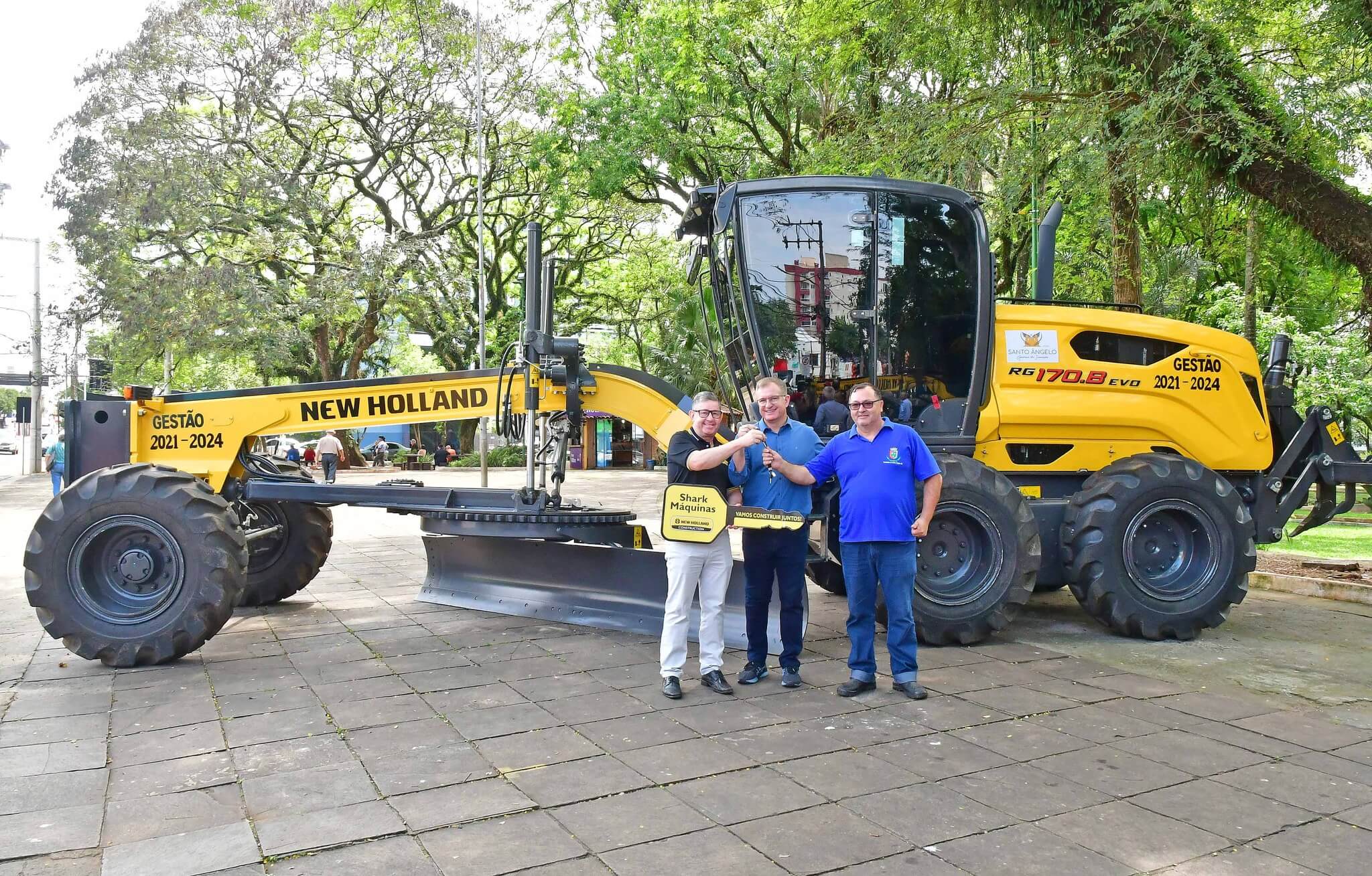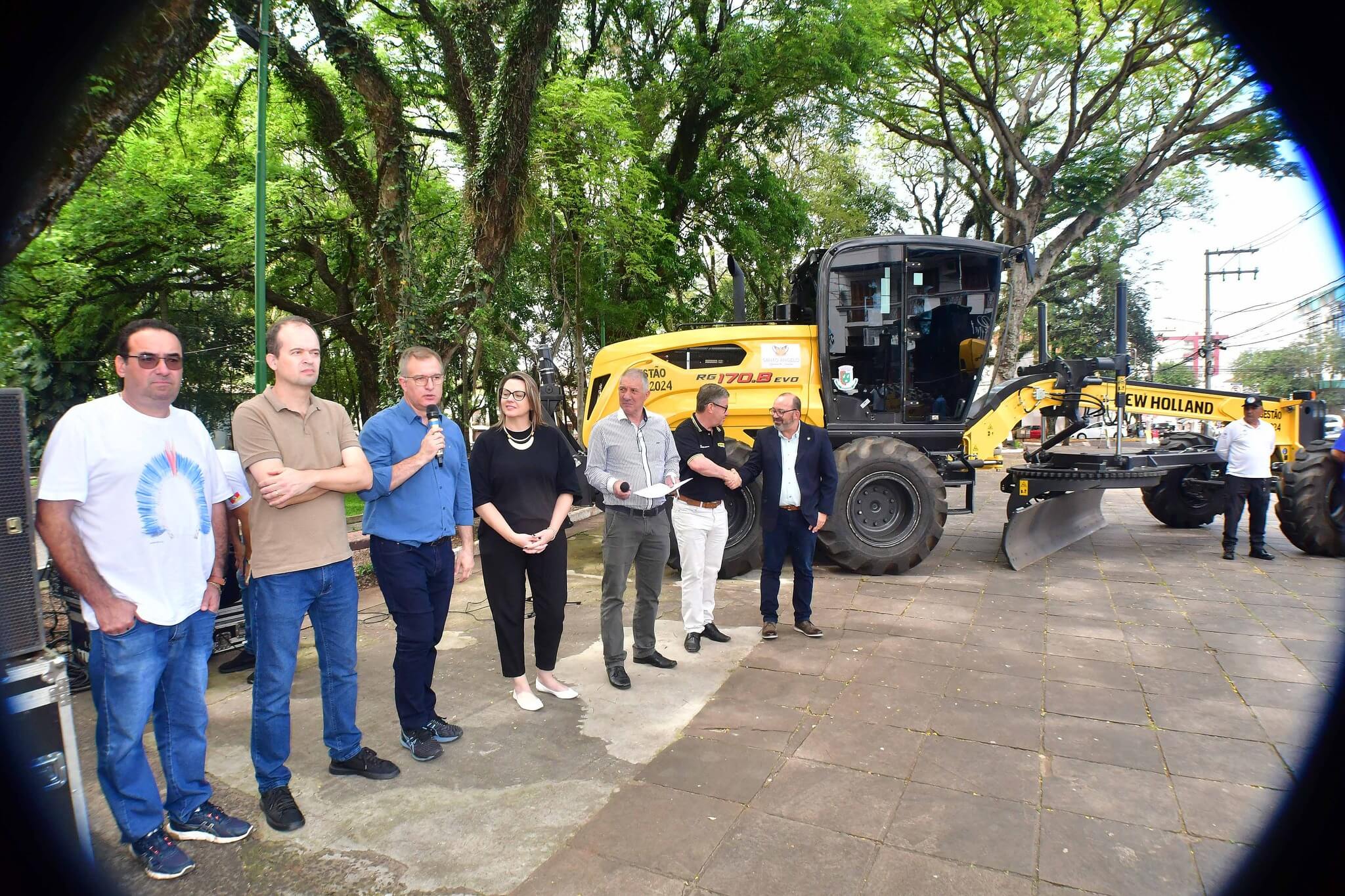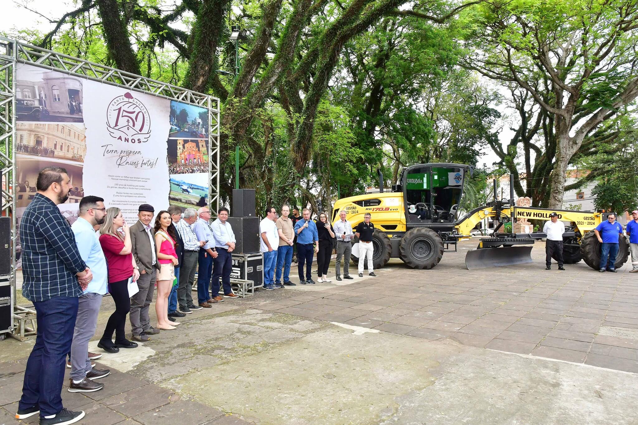 A solenidade de repasse dos maquinários foi realizado na manhã desta sexta-feira, 27, na Praça Leônidas Ribas, a Praça do Brique, e também contou com a presença da primeira-dama Juliana Barbosa; dos secretários municipais João Baptista Santos da Silva (Desenvolvimento Econômico, Turismo e Inovação), Luís Alberto Voese (Gestão de Finanças e presidente da Fenamilho Internacional) e Nader Hassan Awad (Cultura e Esporte); do presidente da Câmara de Vereadores, Carlos Alberto Gonçalves; Pedro Grass, representando o deputado estadual Eduardo Loureiro; vereadores Rodrigo Flores, Simone Lunkes, Vando Ribeiro de Souza, Felippe Terra Grass, Lúcia Lima, Maurício Loureiro e João Cardoso; Laurindo Nikititz, presidente do Sindicato Rural e do Fundestradas; Diomar Formenton, presidente da 11ª FEAAGRI Missões; Oswaldino Lucca, representando o Sindicato dos Trabalhadores Rurais; Sandy Couto, Rainha do Sesquicentenário de Santo Ângelo; Antônio Cardoso, Tassiana Ribeiro, Adilson Almeida e Maykel Mello, diretores de departamentos; o representante da New Holland, Celso Schäffer e servidores do município vinculados às pastas contempladas.