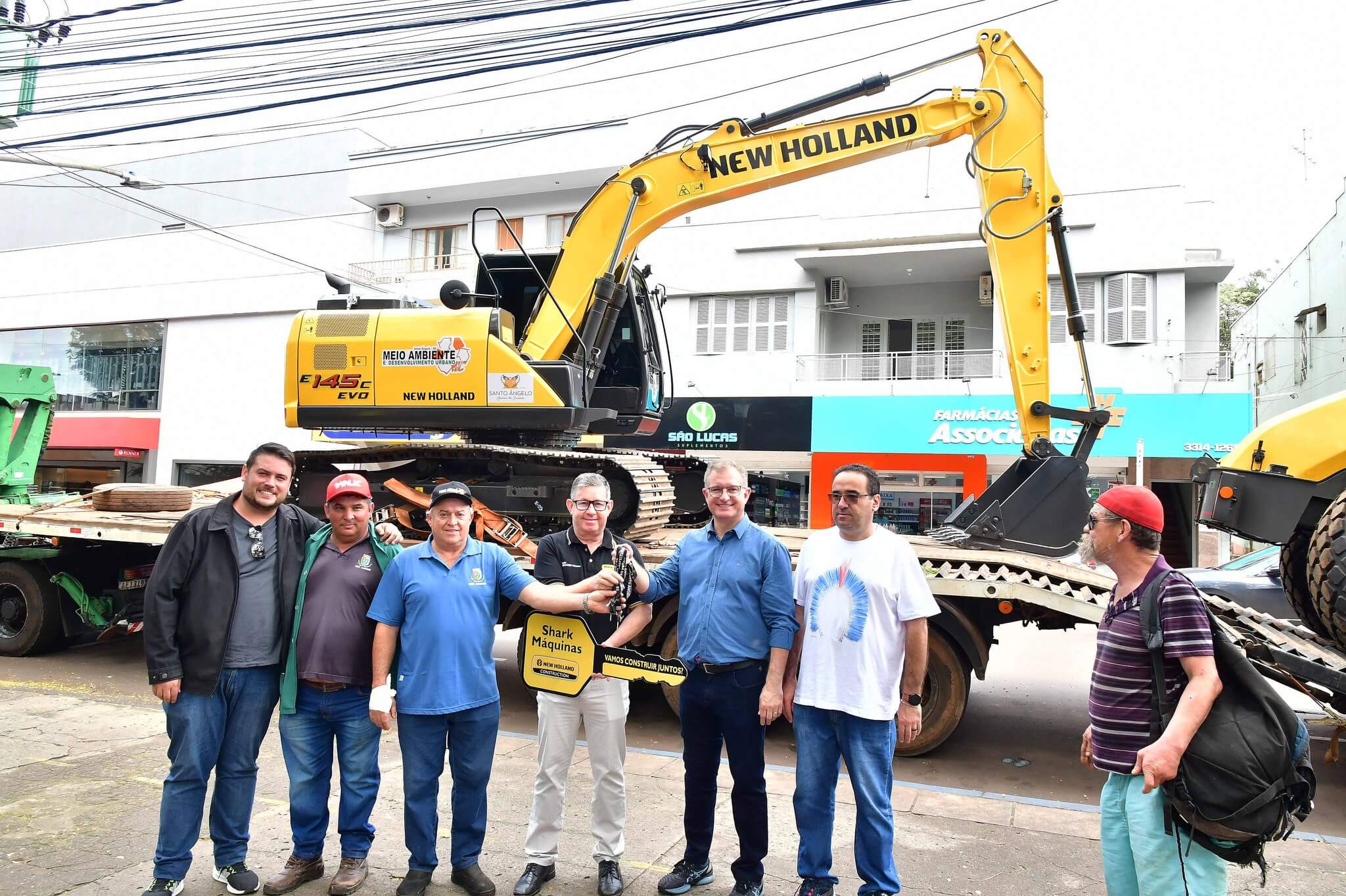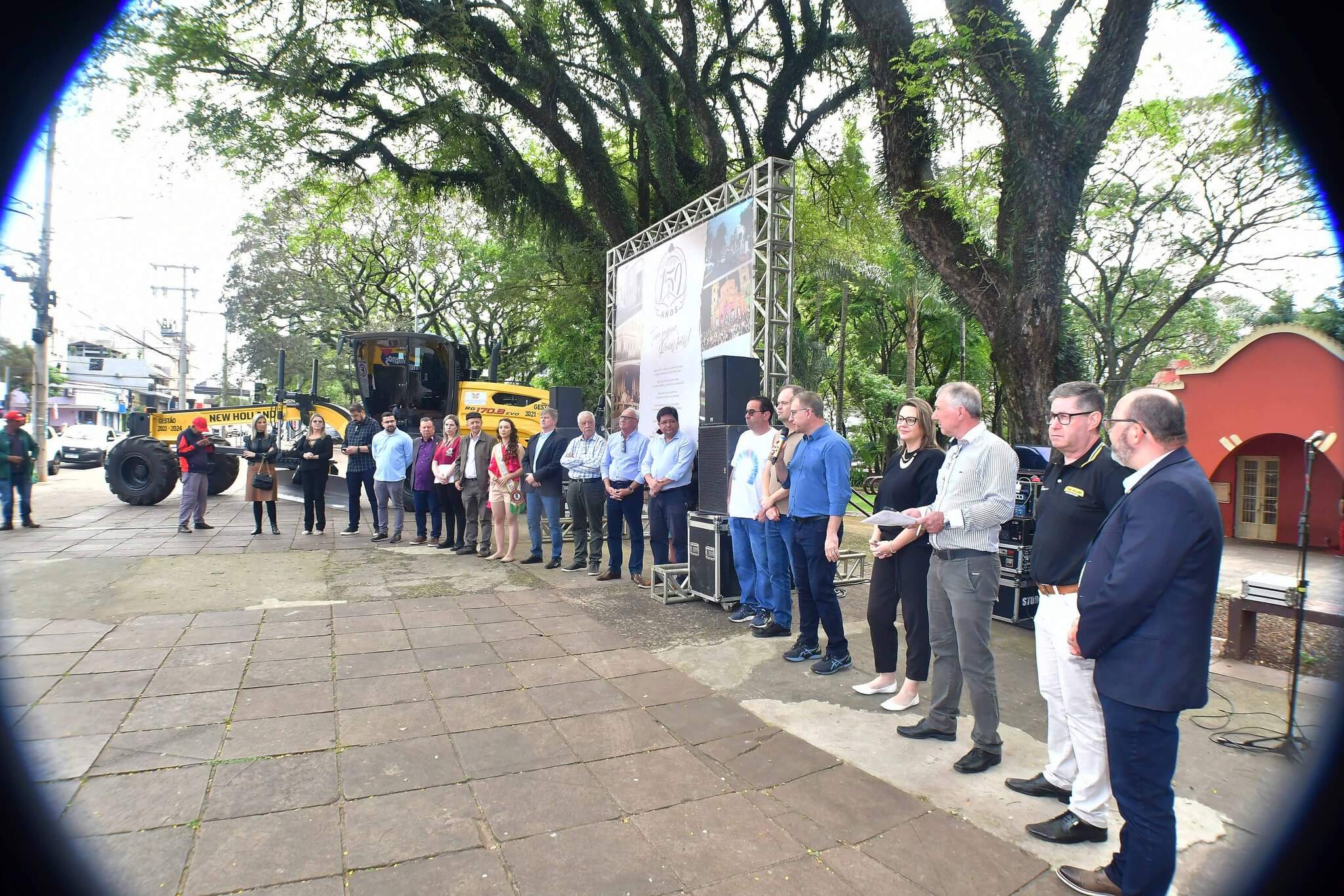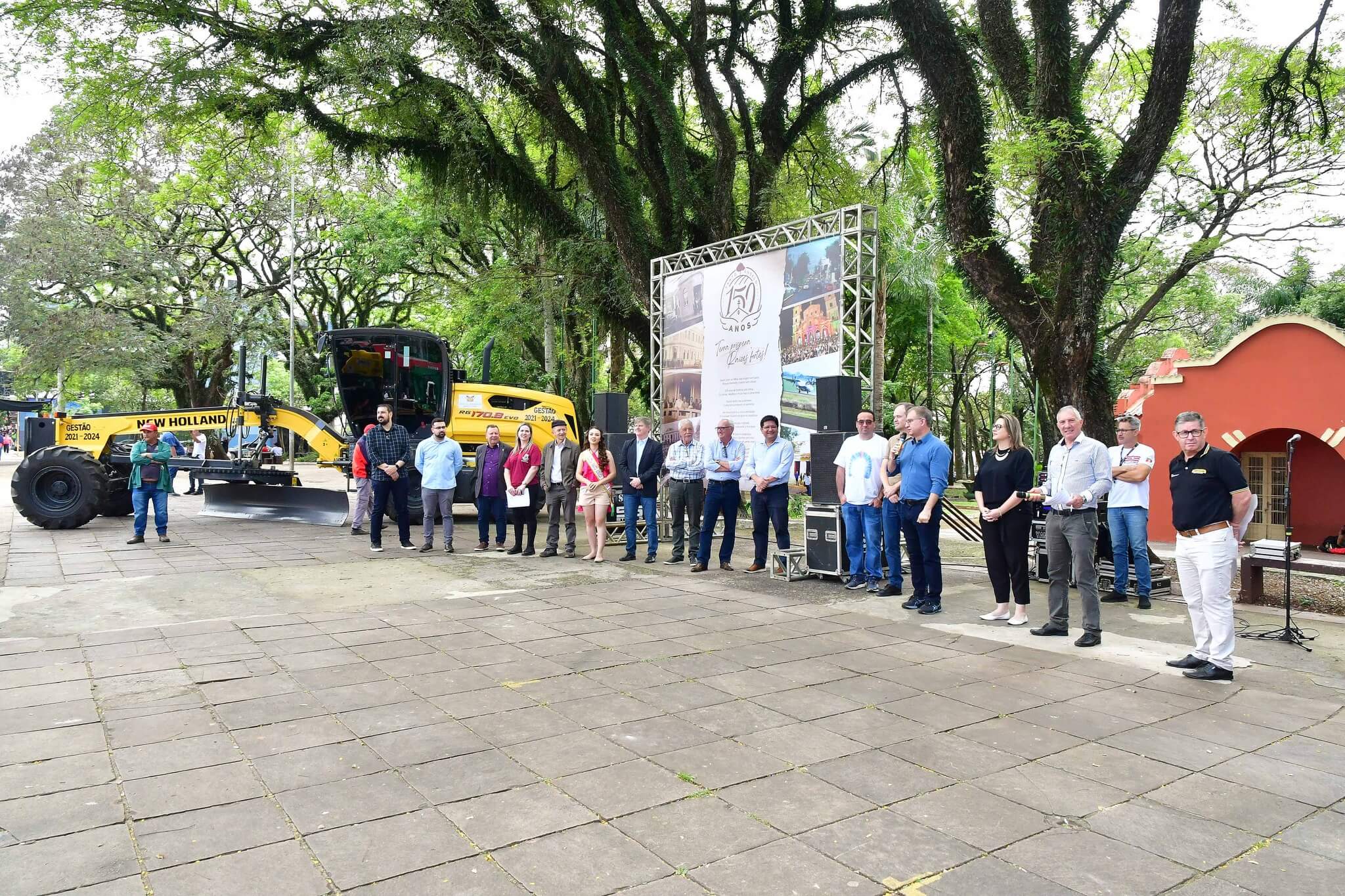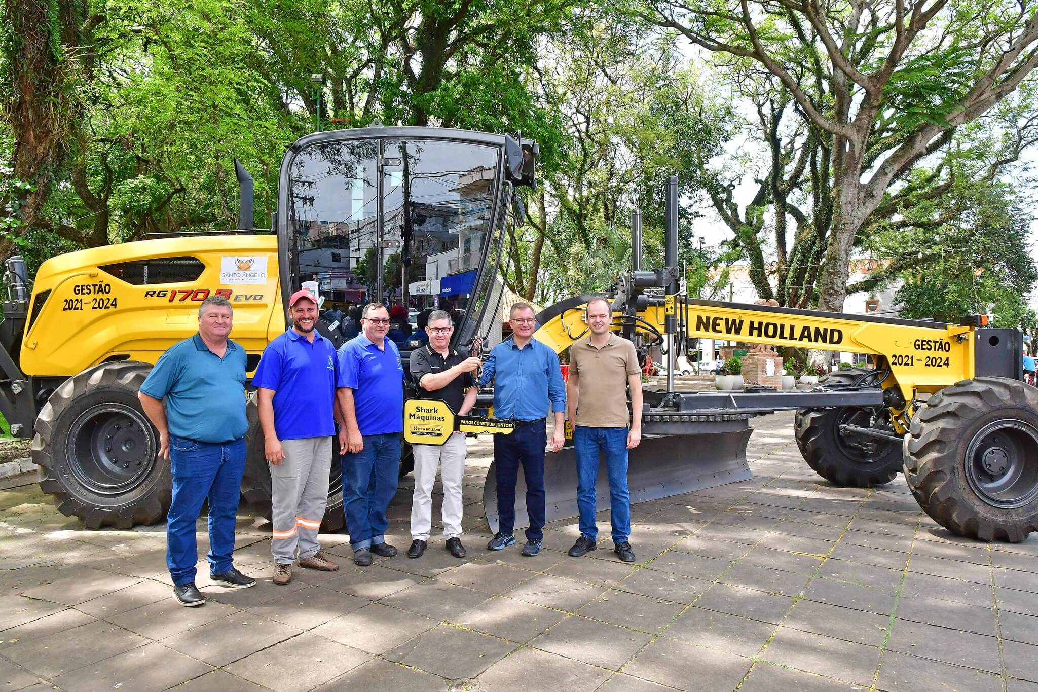 A solenidade de repasse dos maquinários foi realizado na manhã desta sexta-feira, 27, na Praça Leônidas Ribas, a Praça do Brique, e também contou com a presença da primeira-dama Juliana Barbosa; dos secretários municipais João Baptista Santos da Silva (Desenvolvimento Econômico, Turismo e Inovação), Luís Alberto Voese (Gestão de Finanças e presidente da Fenamilho Internacional) e Nader Hassan Awad (Cultura e Esporte); do presidente da Câmara de Vereadores, Carlos Alberto Gonçalves; Pedro Grass, representando o deputado estadual Eduardo Loureiro; vereadores Rodrigo Flores, Simone Lunkes, Vando Ribeiro de Souza, Felippe Terra Grass, Lúcia Lima, Maurício Loureiro e João Cardoso; Laurindo Nikititz, presidente do Sindicato Rural e do Fundestradas; Diomar Formenton, presidente da 11ª FEAAGRI Missões; Oswaldino Lucca, representando o Sindicato dos Trabalhadores Rurais; Sandy Couto, Rainha do Sesquicentenário de Santo Ângelo; Antônio Cardoso, Tassiana Ribeiro, Adilson Almeida e Maykel Mello, diretores de departamentos; o representante da New Holland, Celso Schäffer e servidores do município vinculados às pastas contempladas.