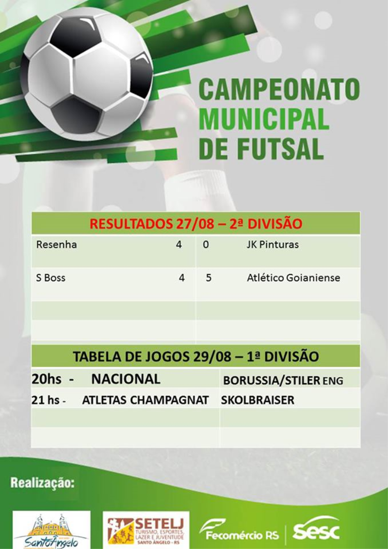 Na noite desta terça-feira, 27, foram realizados dois jogos pelo campeonato municipal de futsal da segunda divisão. Confrontos da primeira divisão acontecem nesta quinta-feira, 29, em razão da cedência do Ginásio Marcelo Mioso para o Grand Slam Missões de Vôlei na sexta.