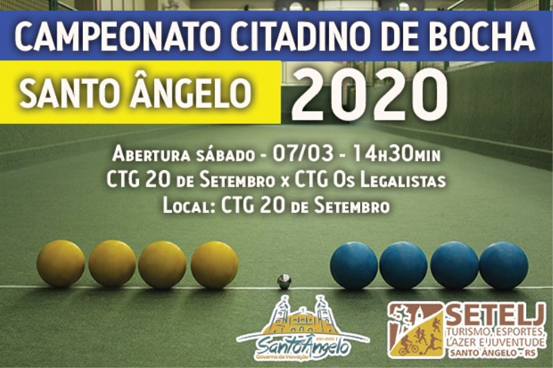 Inaugura neste sábado, 07, no CTG 20 de Setembro, a temporada de esportes 2020 da Secretaria Municipal de Turismo, Esporte, Lazer e Juventude (SETELJ), com a abertura do Campeonato Citadino de Bocha de Santo Ângelo e, no domingo, às 15 horas, na sede campestre da AABB, o Campeonato Municipal de Futebol Sete Veterano.