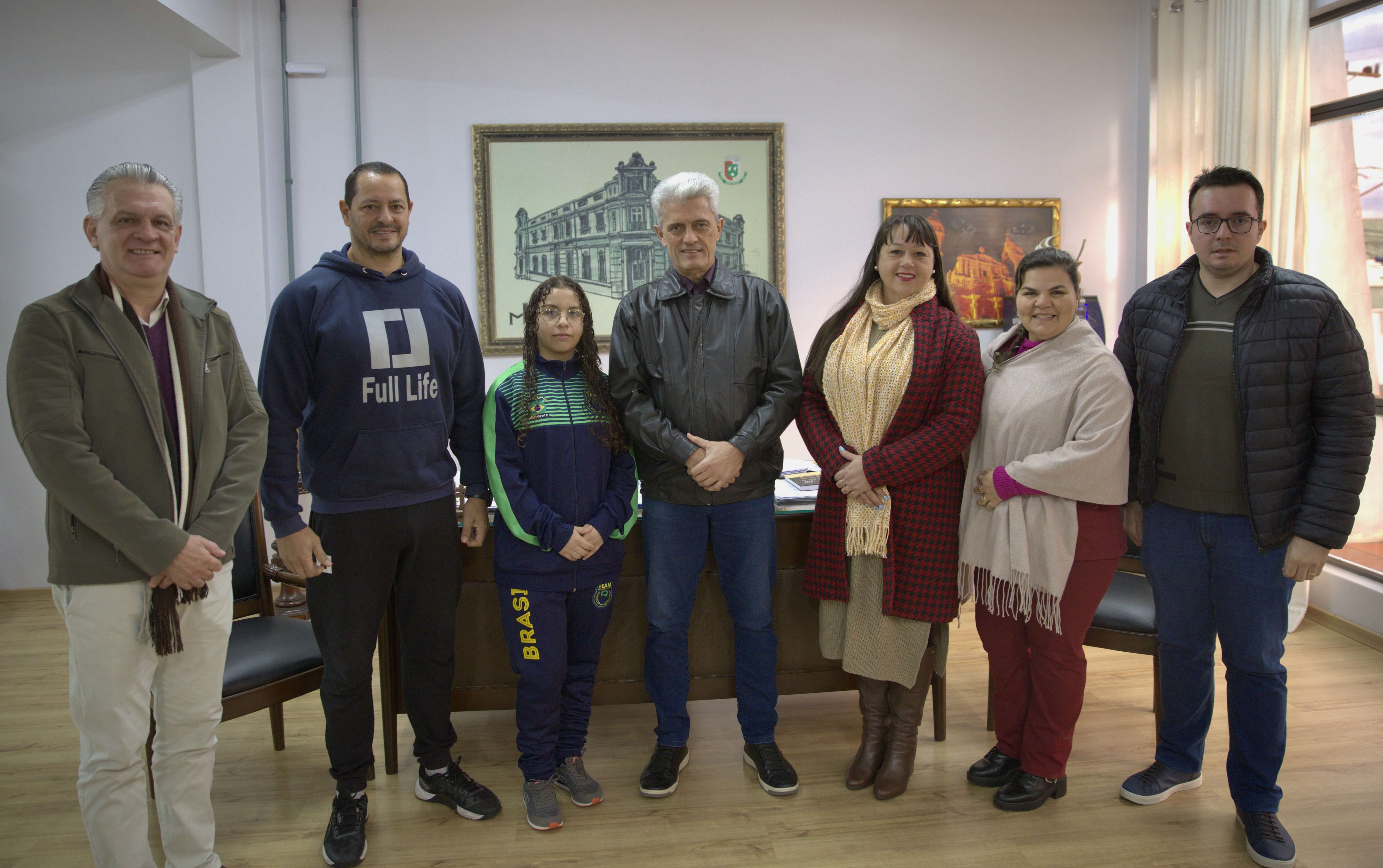 Na manhã desta segunda-feira (02), a atleta foi recebida pelo prefeito Nivio Braz, acompanhada pela secretária municipal de Educação, Eliane Carpes, pela diretora da escola, Thalita da Costa, pelo coach Ricardo Dable, do Crossfit Full Life, e pelo chefe de gabinete Carlos Kelm.