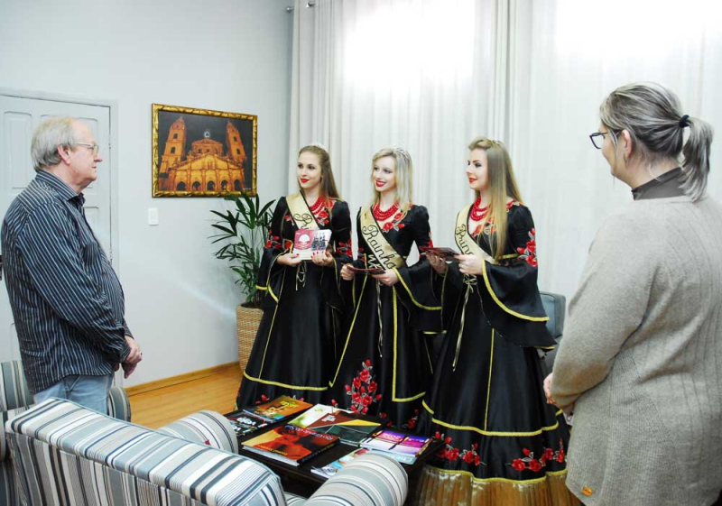O vice-prefeito Bruno Hesse recebeu na manhã desta sexta-feira, 19, no Gabinete do Executivo, as soberanas da 14ª Polfest Internacional, festa tradicional de Guarani das Missões, e que acontecerá de 26 a 28 deste mês, no Parque de Eventos Clemente Vicente Binkowski.