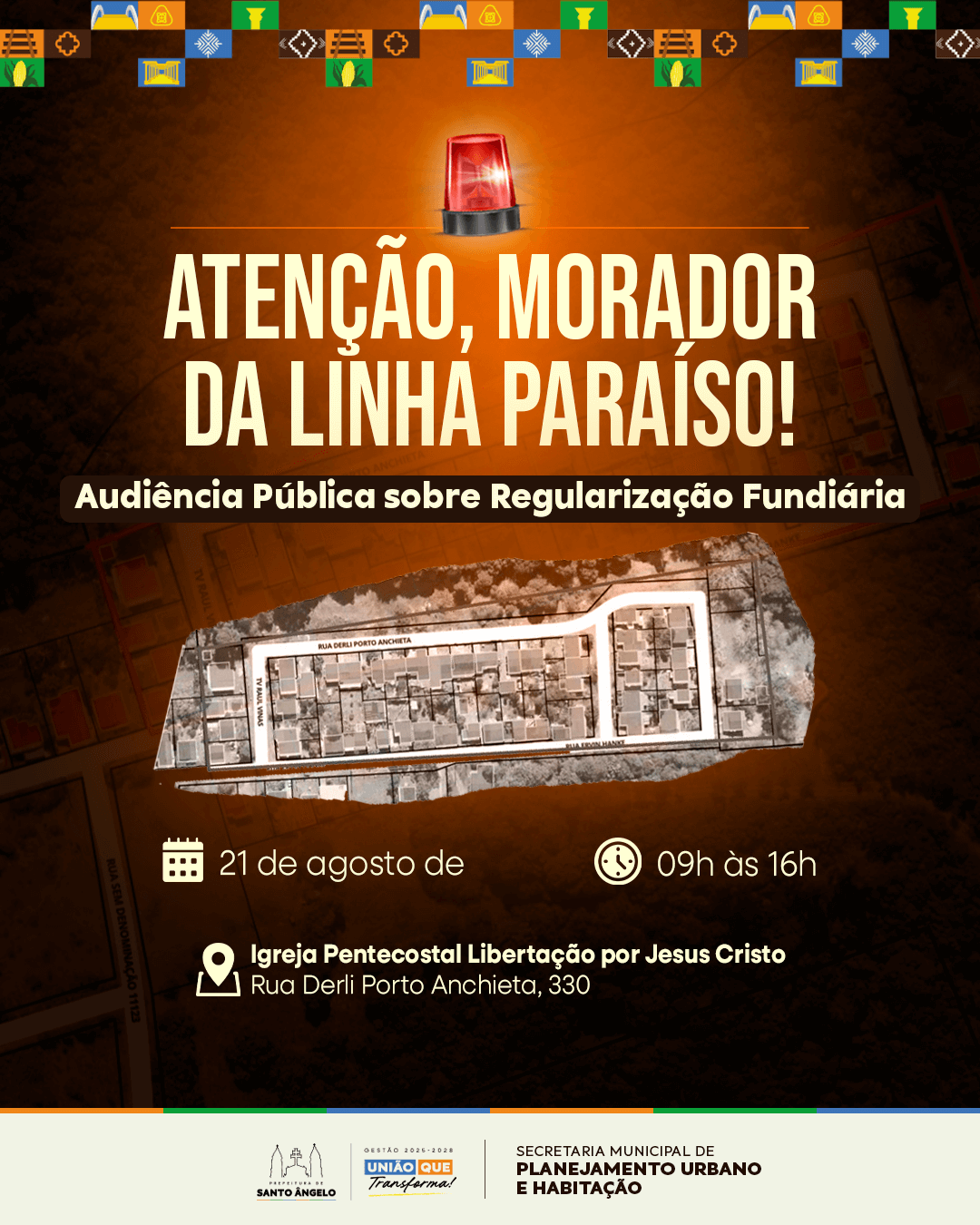 A Prefeitura de Santo Ângelo, por meio da Secretaria Municipal de Planejamento Urbano e Habitação, convida os moradores da Linha Paraíso, do quadrilátero entre a Travessa Raul Vinas, a Rua Derli Porto Anchieta e a Rua Ervin Hanke. O evento será realizado nesta quinta-feira (21), às 19h, na Igreja Pentecostal Libertação por Jesus Cristo (R. Derli Porto Anchieta, 330).