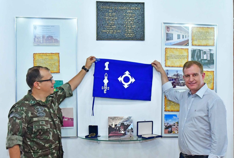 Jacques e o comandante do B Com descarraram a placa comemorativa que passou a compor a galeria do Salão Nobre do 1º Batalhão de Comunicações-General Mário da Silva Miranda.