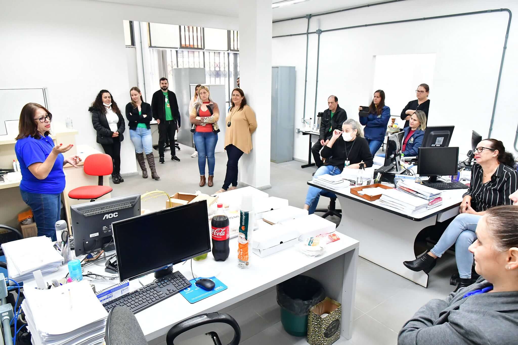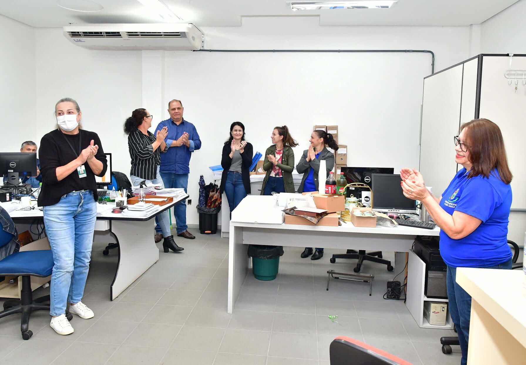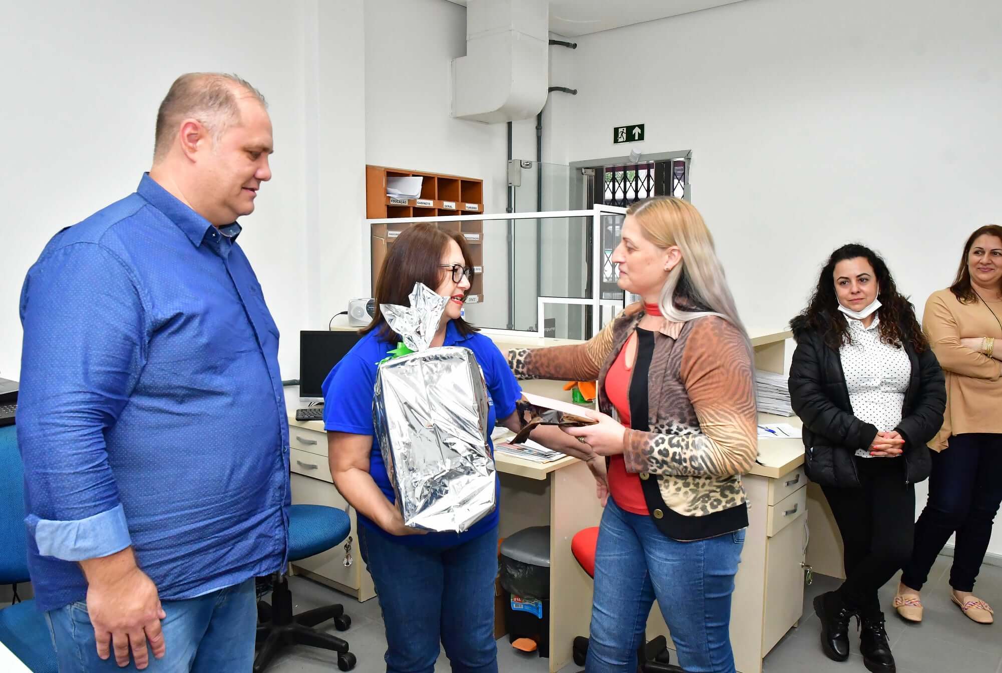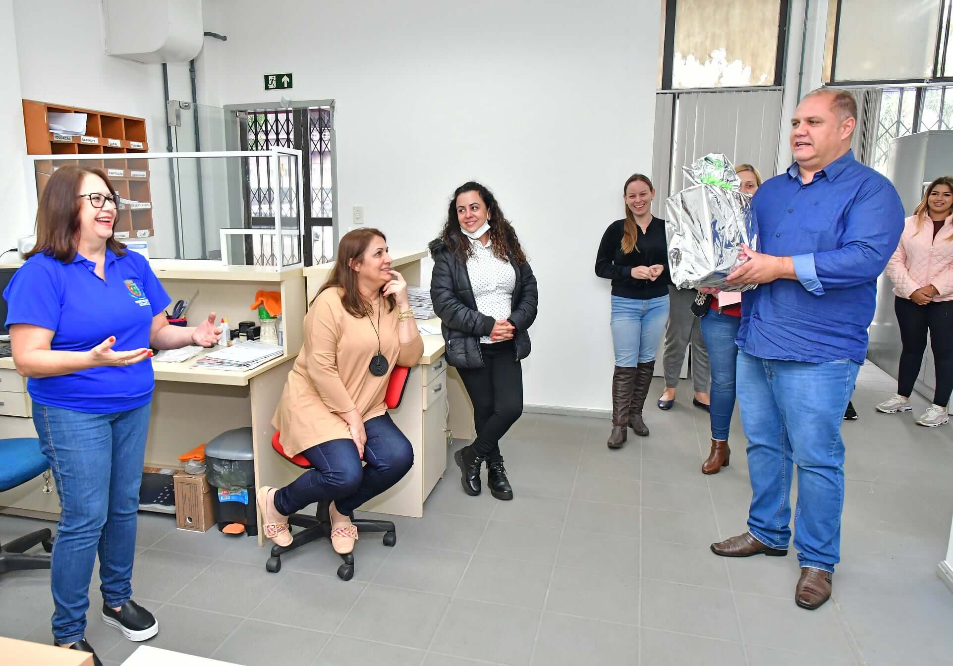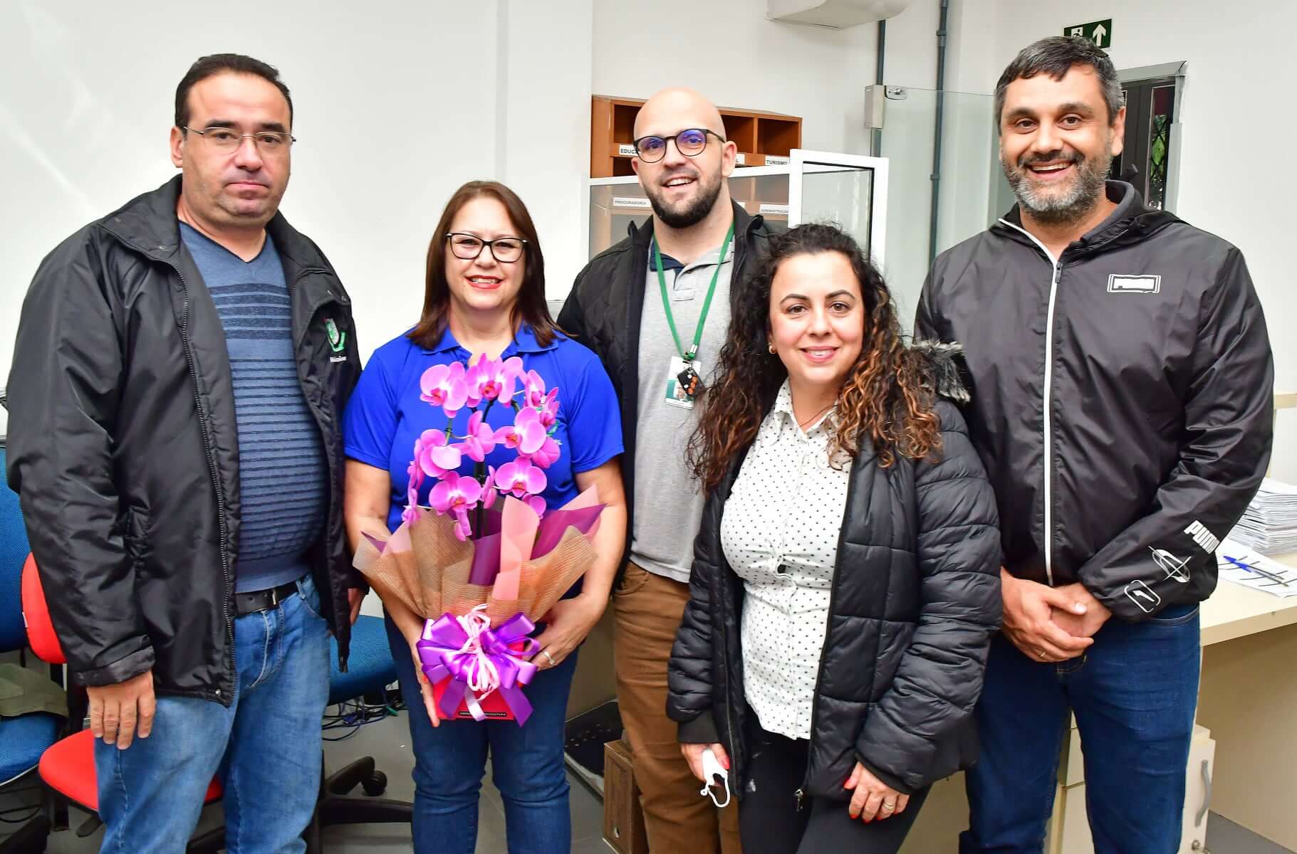 O prefeito Jacques Barbosa, vice-prefeito Volnei Teixeira, secretários Luís Alberto Voese e Francisco da Silva Medeiros e colegas homenagearam e agradeceram Valquíria pelo seu trabalho no poder público municipal no ato realizado após o fim do expediente.