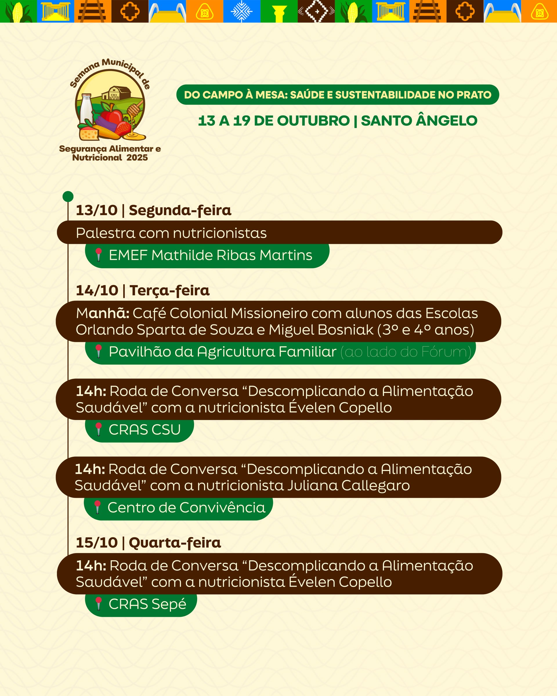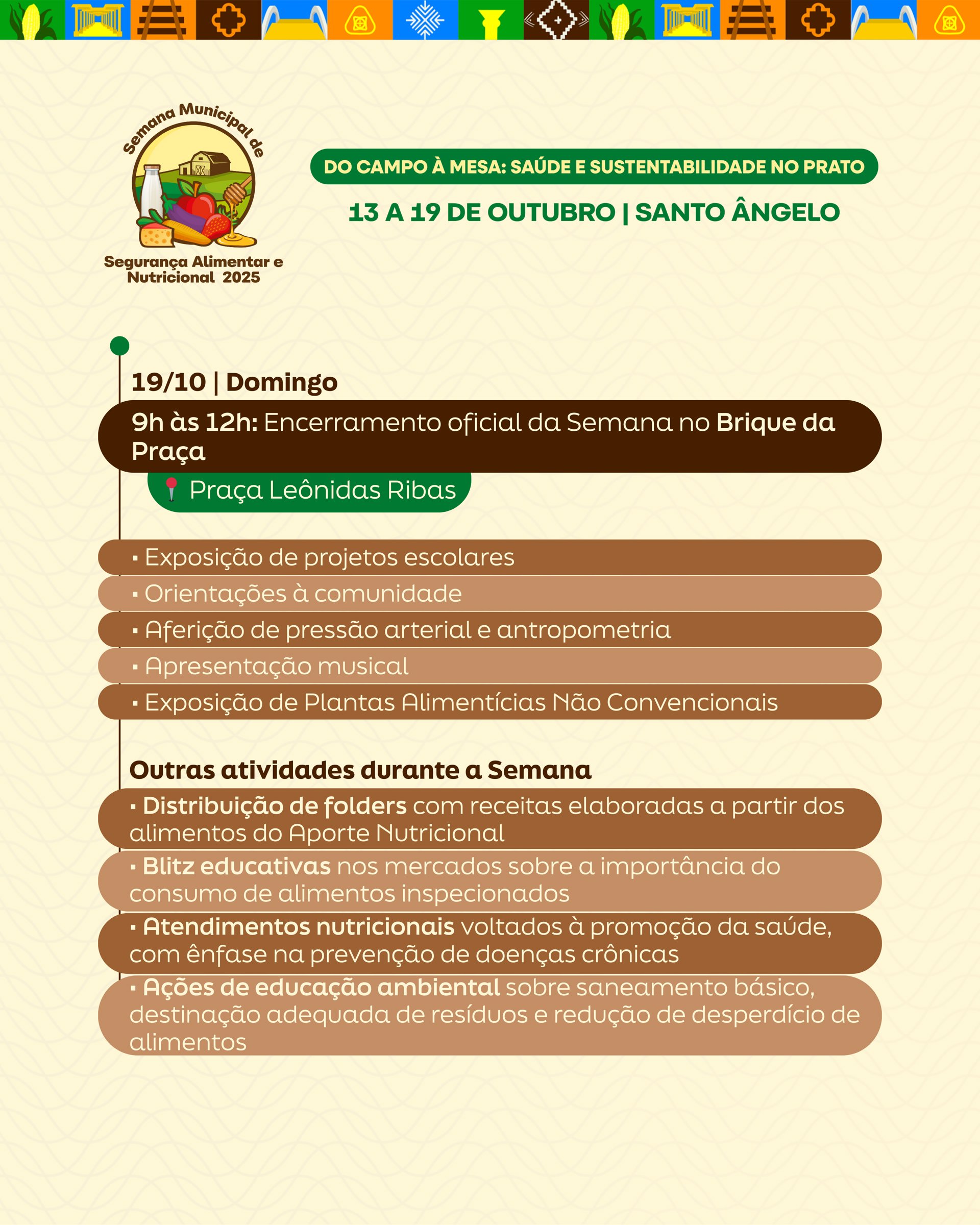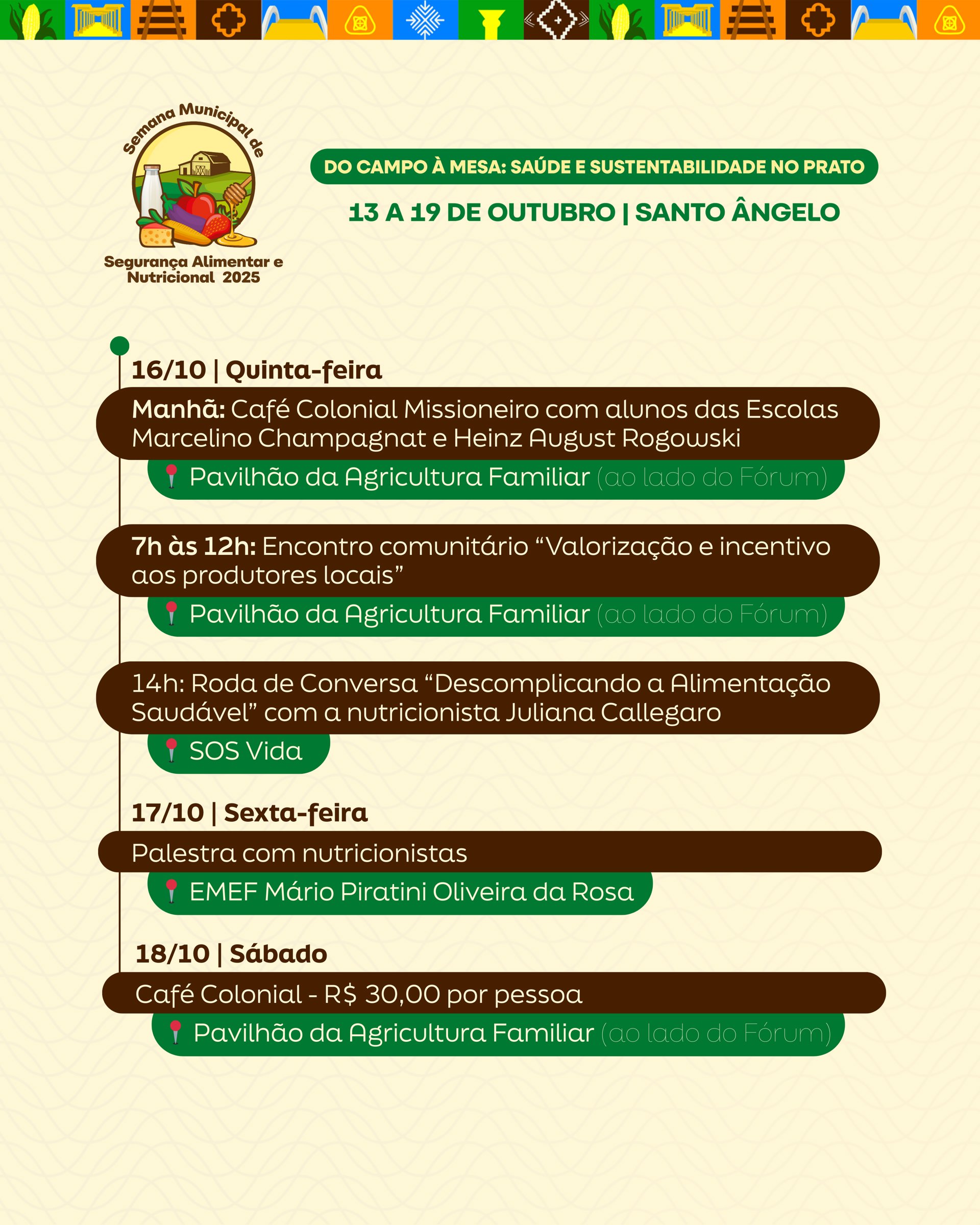 De 13 a 19 de outubro, Santo Ângelo promove a Semana Municipal de Segurança Alimentar e Nutricional (SAN), com uma intensa programação que inclui rodas de conversa, palestras e ações educativas. A iniciativa foi oficializada pela Lei Municipal nº 4.824, de 1º de julho de 2025, que instituiu o evento no calendário oficial do município.