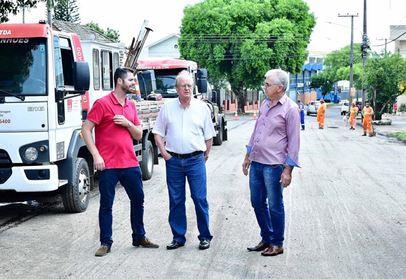 O prefeito em Exercício Bruno Hesse e o secretário municipal de Obras e Serviços Urbanos, Adolar Queiroz, acompanharam na tarde desta quarta-feira, 20, o início das obras de recuperação asfáltica na Rua Tiradentes, trecho de 630 metros, entre a Avenida Venâncio Aires e a Rua Alfredo Leopoldo Fett.