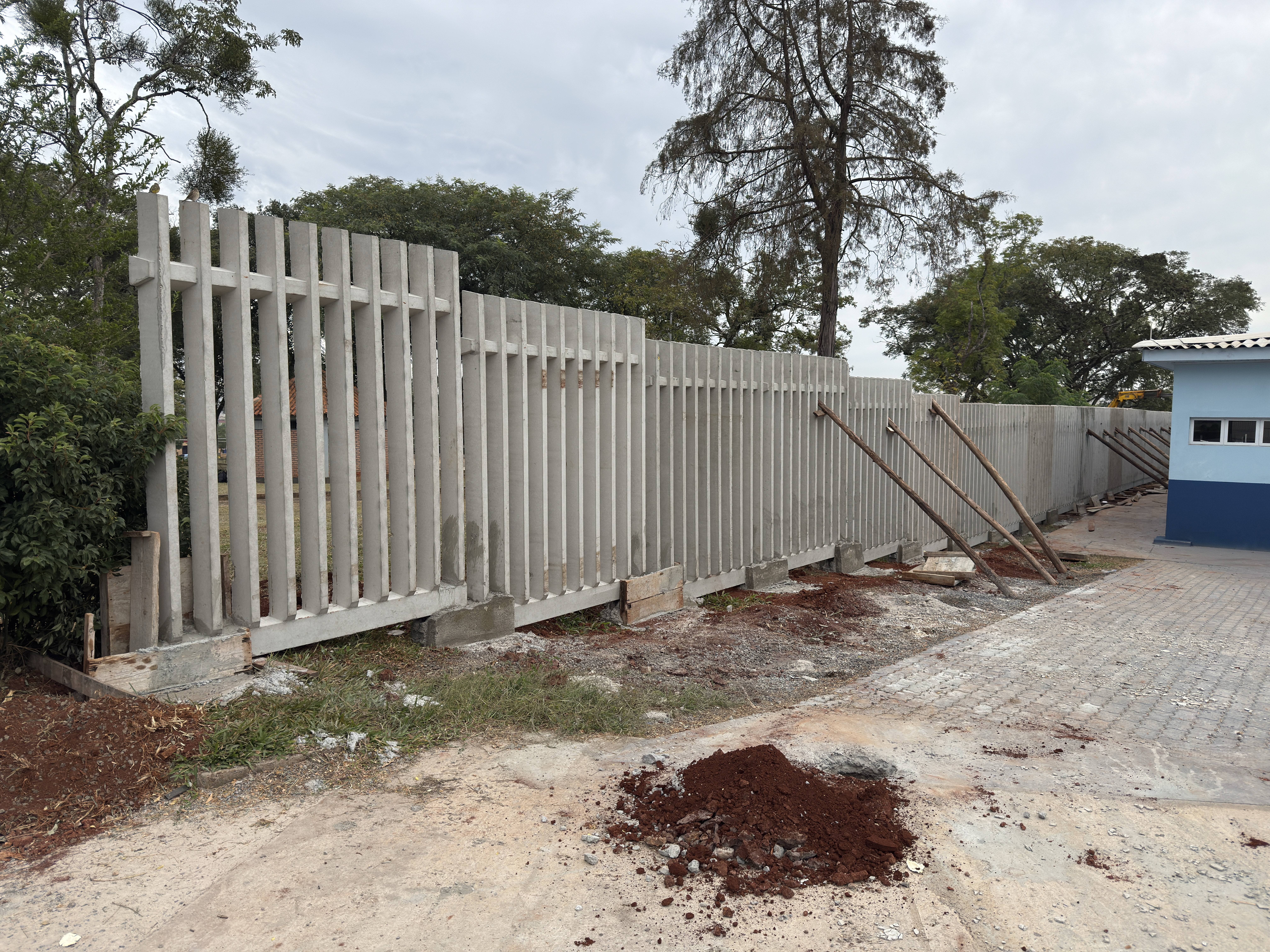 Atualmente, está sendo realizado o fechamento da fachada Oeste com gradil de concreto pré-moldado, serviço que integra a etapa anterior da obra.