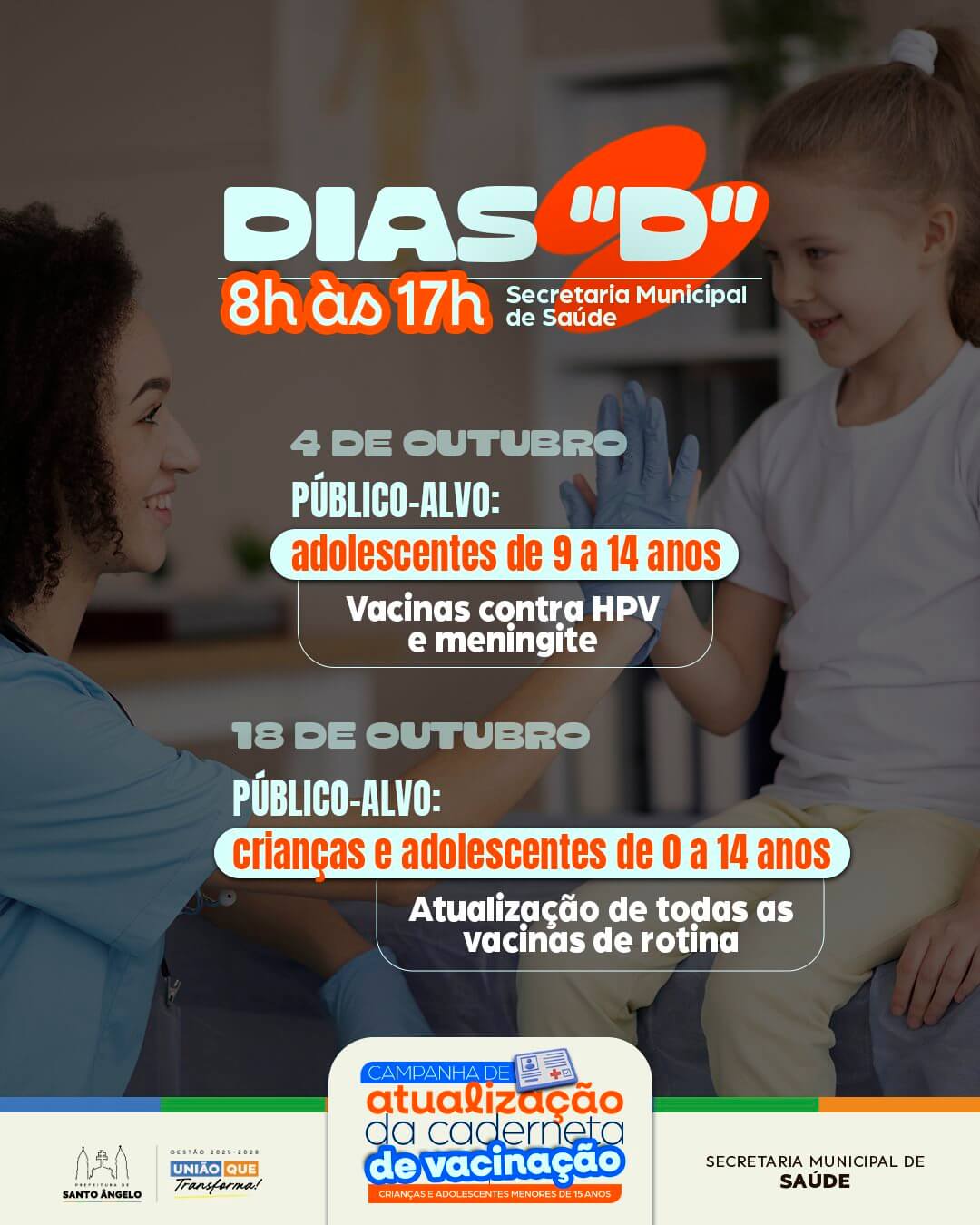 Neste sábado (4), acontece o primeiro Dia D da Campanha de Atualização da Caderneta de Vacinação de crianças e jovens menores de 15 anos. A ação ocorre na Secretaria Municipal de Saúde, das 8h às 17h, tendo como público-alvo adolescentes de 9 a 14 anos, com foco na imunização contra HPV e meningite.