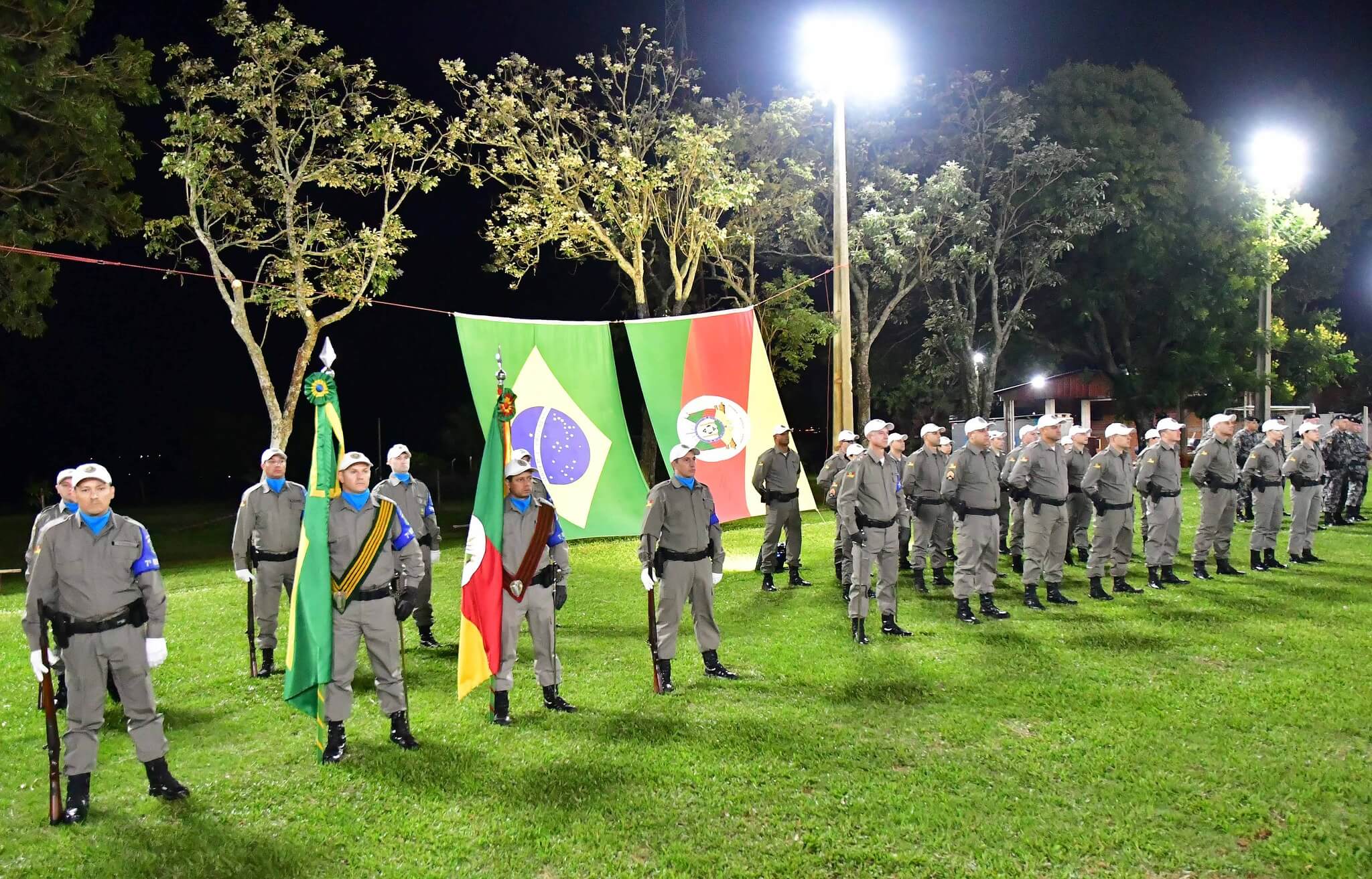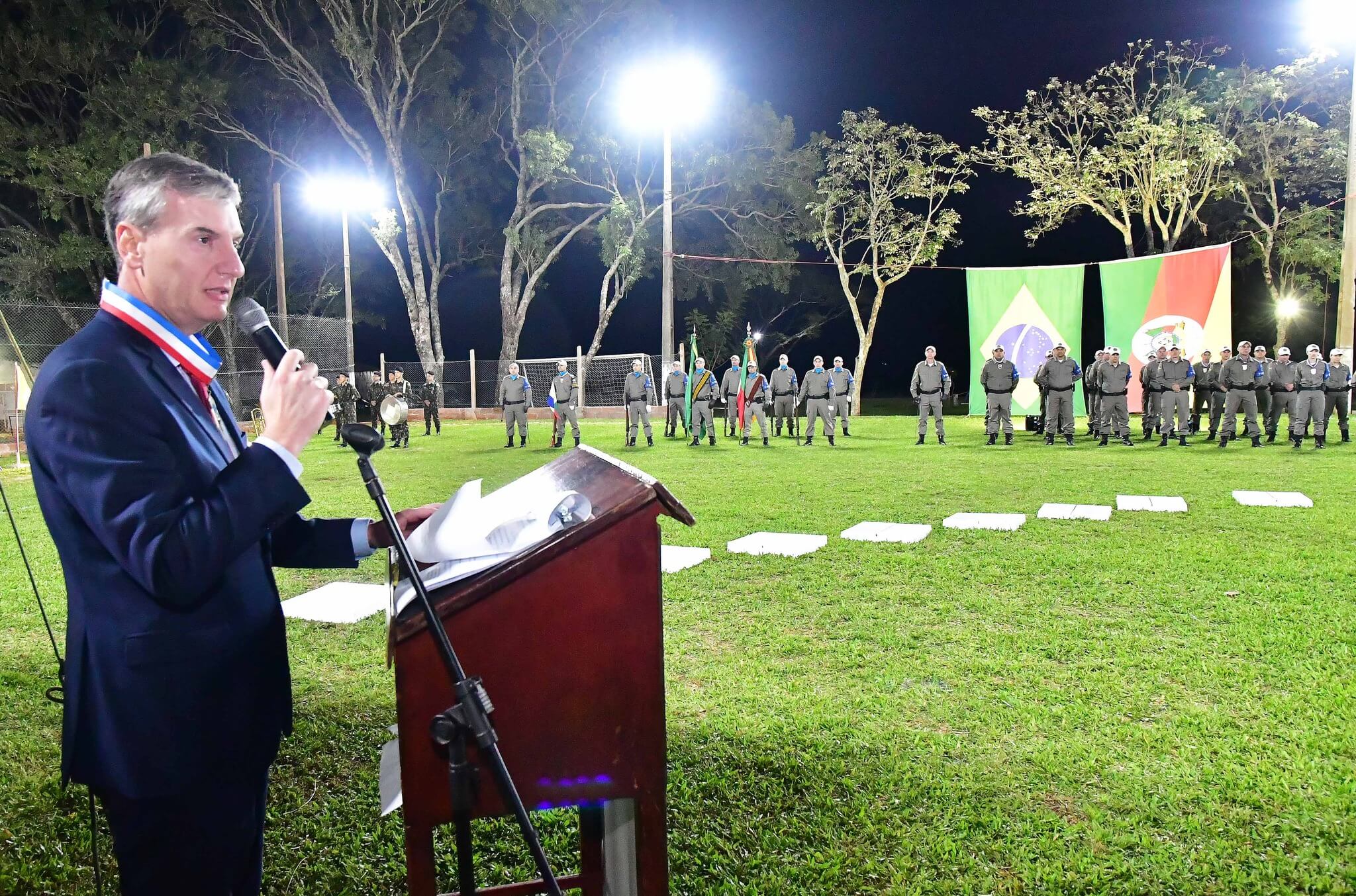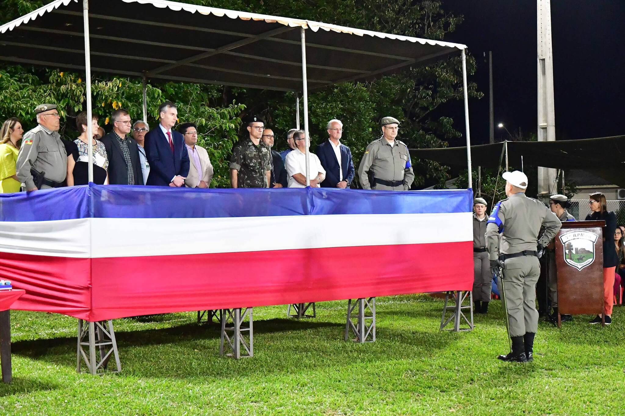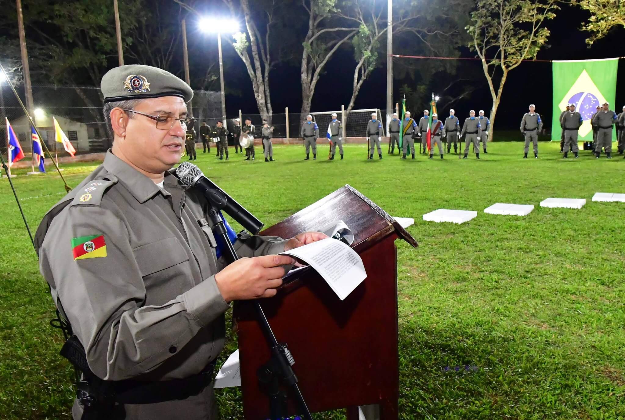 O comandante do 7º RPMon, major Enízio da Silveira Vasconcelos, recepcionou os PMs formandos, seus familiares, autoridades e convidados. Também participaram do ato, o comandante do CRPO Missões, tenente-coronel Edilson Della Flora Góes, e o comandante do 1º B Com, tenente-coronel Japhet Luiz Barbosa.