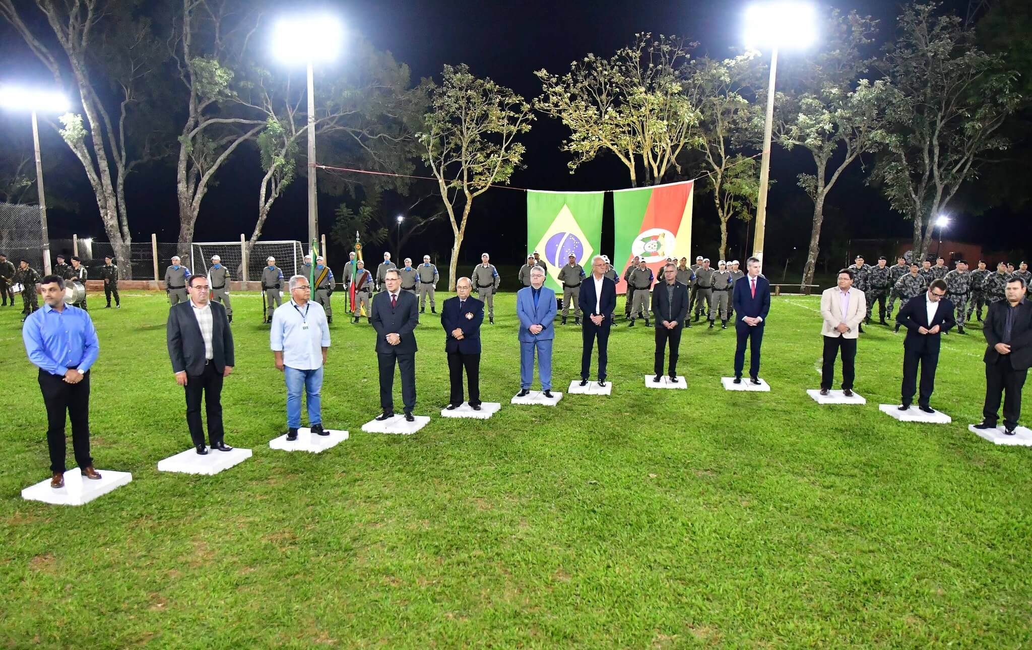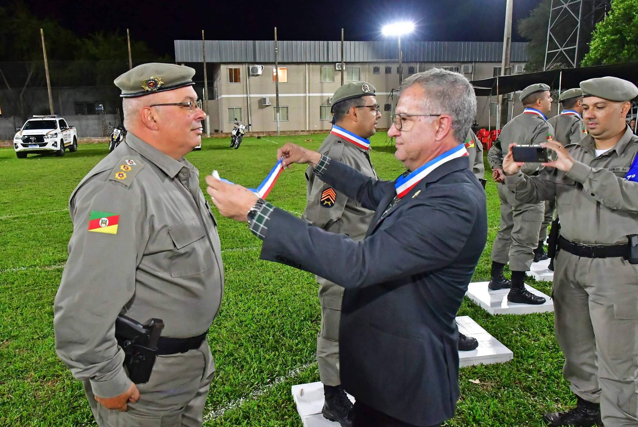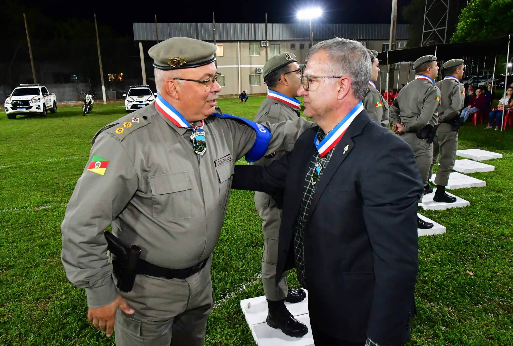 O comandante do 7º RPMon, major Enízio da Silveira Vasconcelos, recepcionou os PMs formandos, seus familiares, autoridades e convidados. Também participaram do ato, o comandante do CRPO Missões, tenente-coronel Edilson Della Flora Góes, e o comandante do 1º B Com, tenente-coronel Japhet Luiz Barbosa.