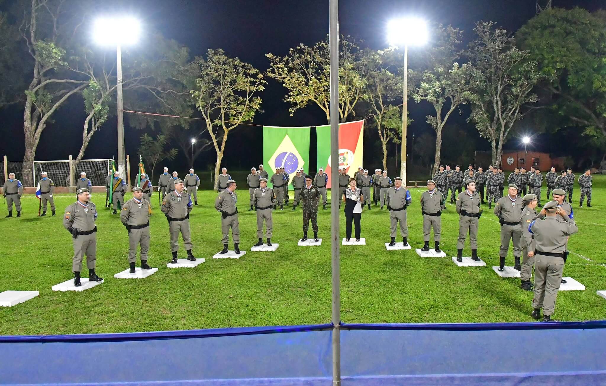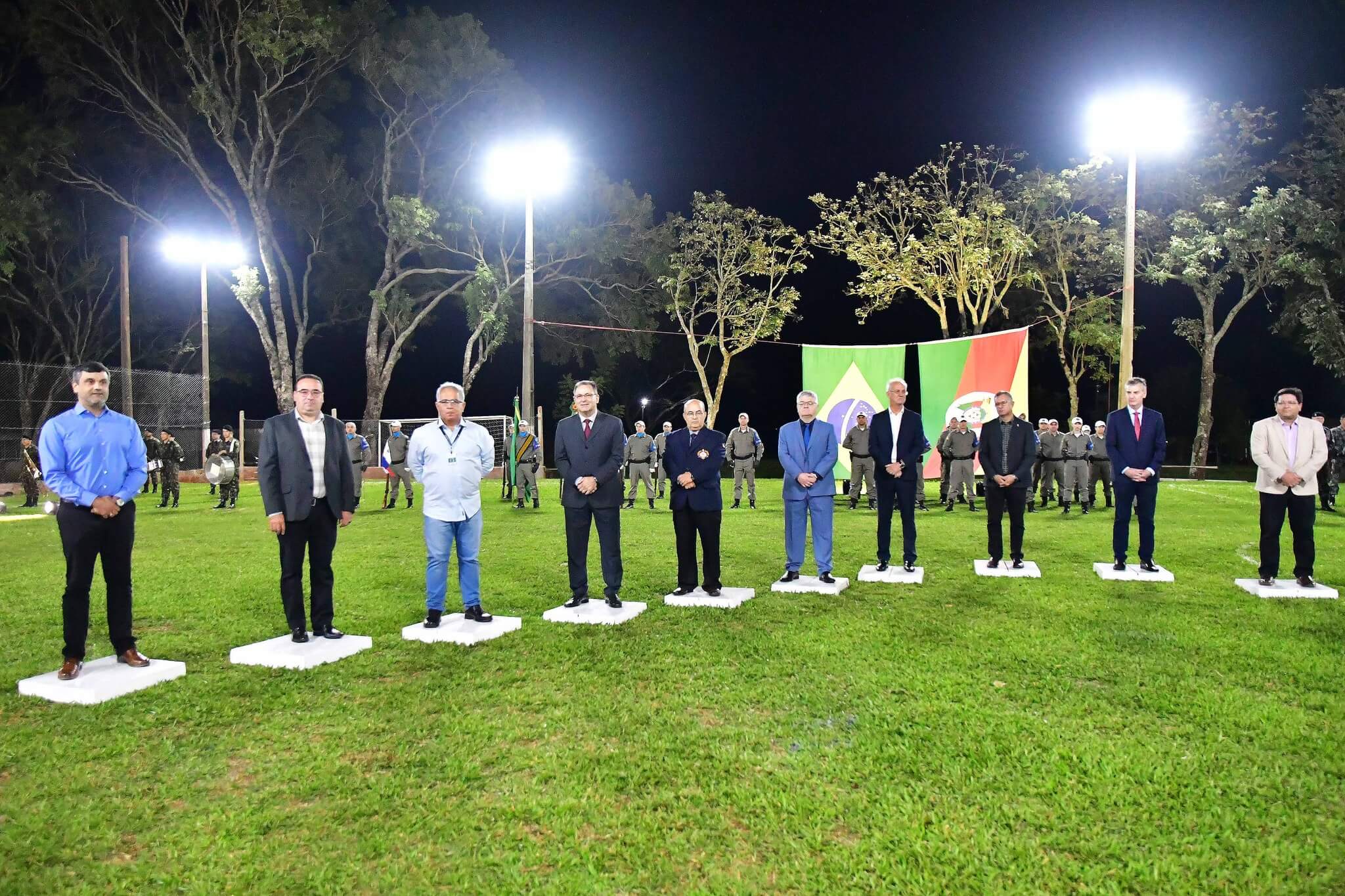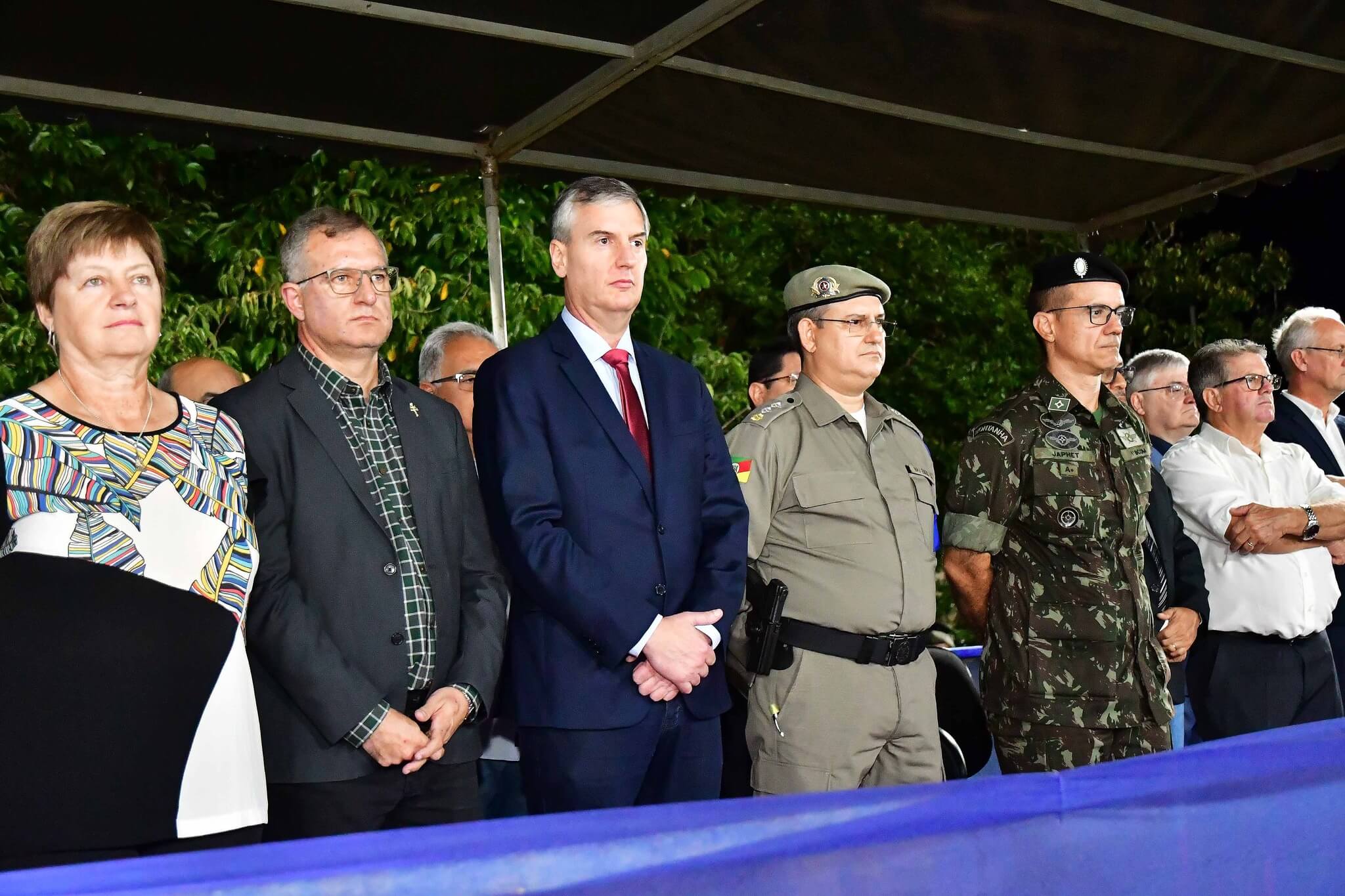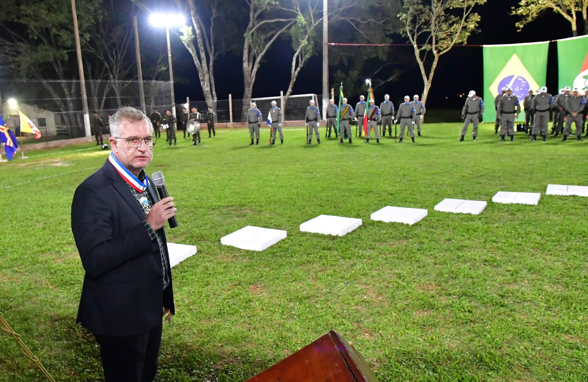 O comandante do 7º RPMon, major Enízio da Silveira Vasconcelos, recepcionou os PMs formandos, seus familiares, autoridades e convidados. Também participaram do ato, o comandante do CRPO Missões, tenente-coronel Edilson Della Flora Góes, e o comandante do 1º B Com, tenente-coronel Japhet Luiz Barbosa.
