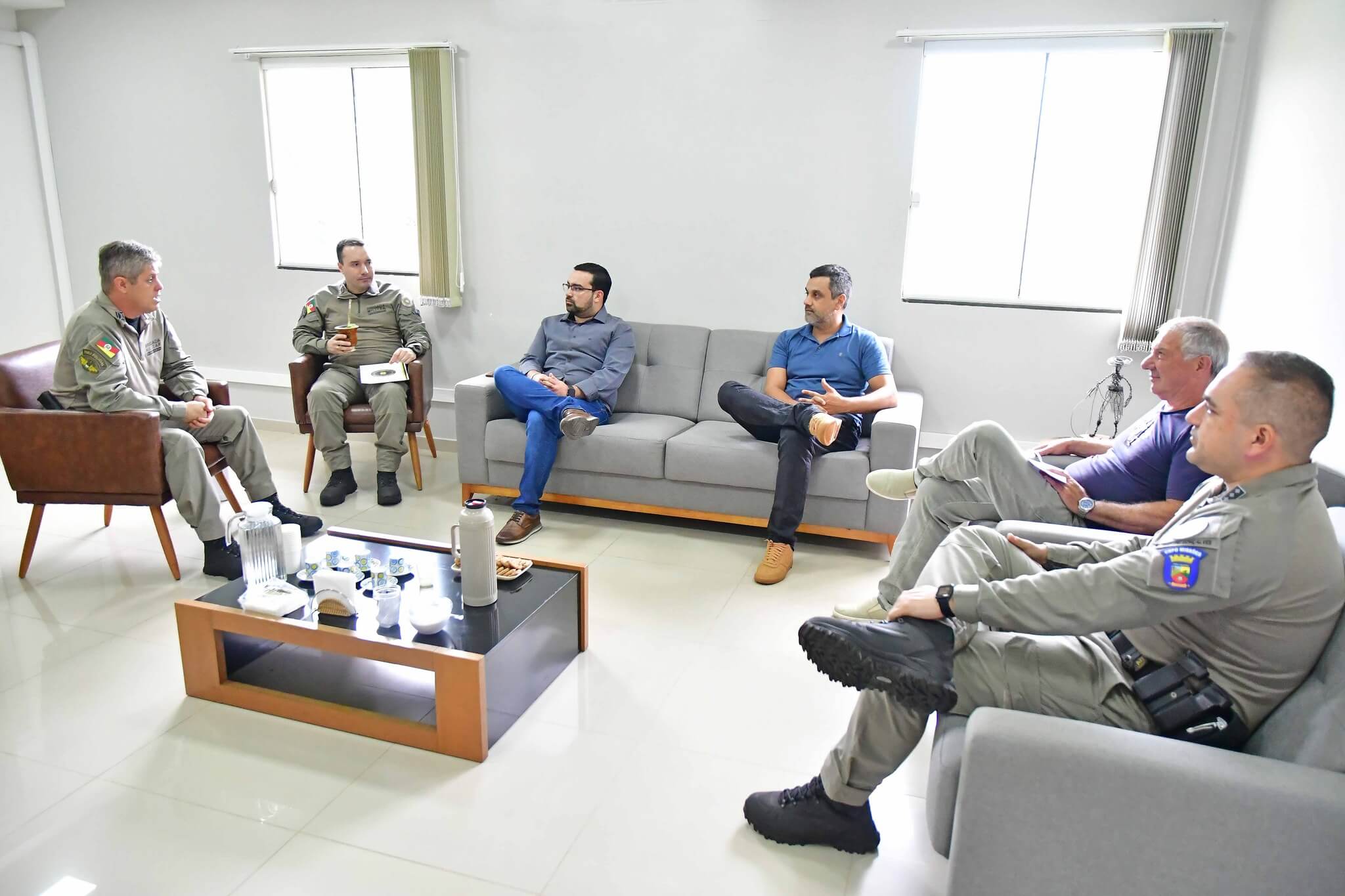 Na reunião com o comandante do CRPO Missões, coronel Alexander Duarte; chefe do Estado Maior, major João do Amaral Pereira e do capitão João Pedro da Silva Gonçalves, o chefe interino do Executivo falou sobre o projeto do cercamento eletrônico de Santo Ângelo.