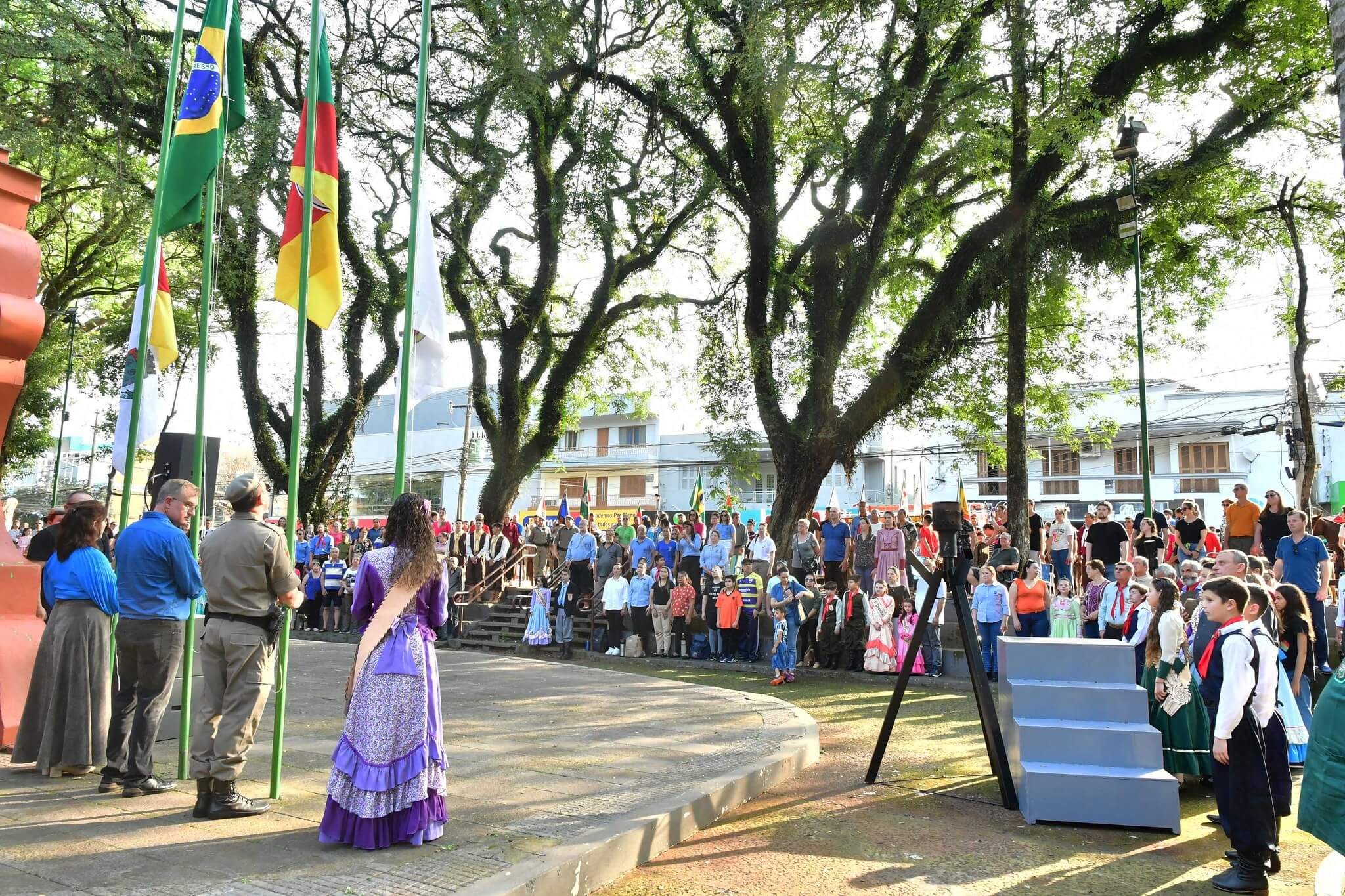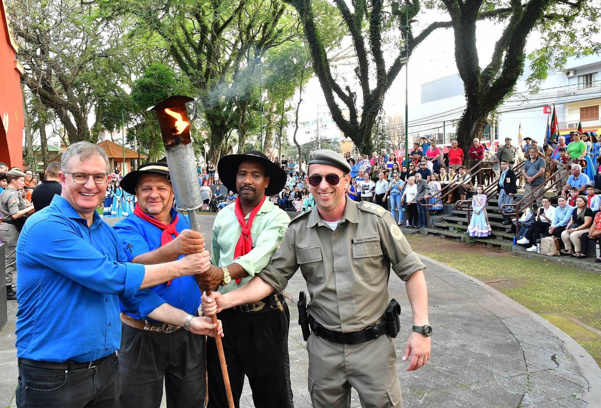A abertura da Semana Farroupilha em Santo Ângelo foi realizada na tarde do último domingo na Praça Leônidas Ribas com a cerimônia de recebimento da Chama Crioula. A comissão organizadora é presidida pelo comandante do 7ºRPMon, major Régis Copetti.